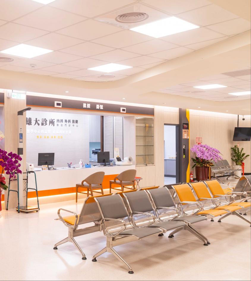 設計團隊為了讓醫療人員有舒適且不失專業的工作環境,針對雄大診所設計一系列企業識別系統-以太陽神橘溫暖朝氣的意象,融入空間設計,更善用建築的大面積採光,營造出室內自然的氛圍,打造出溫馨舒適的醫療空間,舒緩民眾就醫的緊張感,更能減少燈具電力消耗達到節能的目的。
