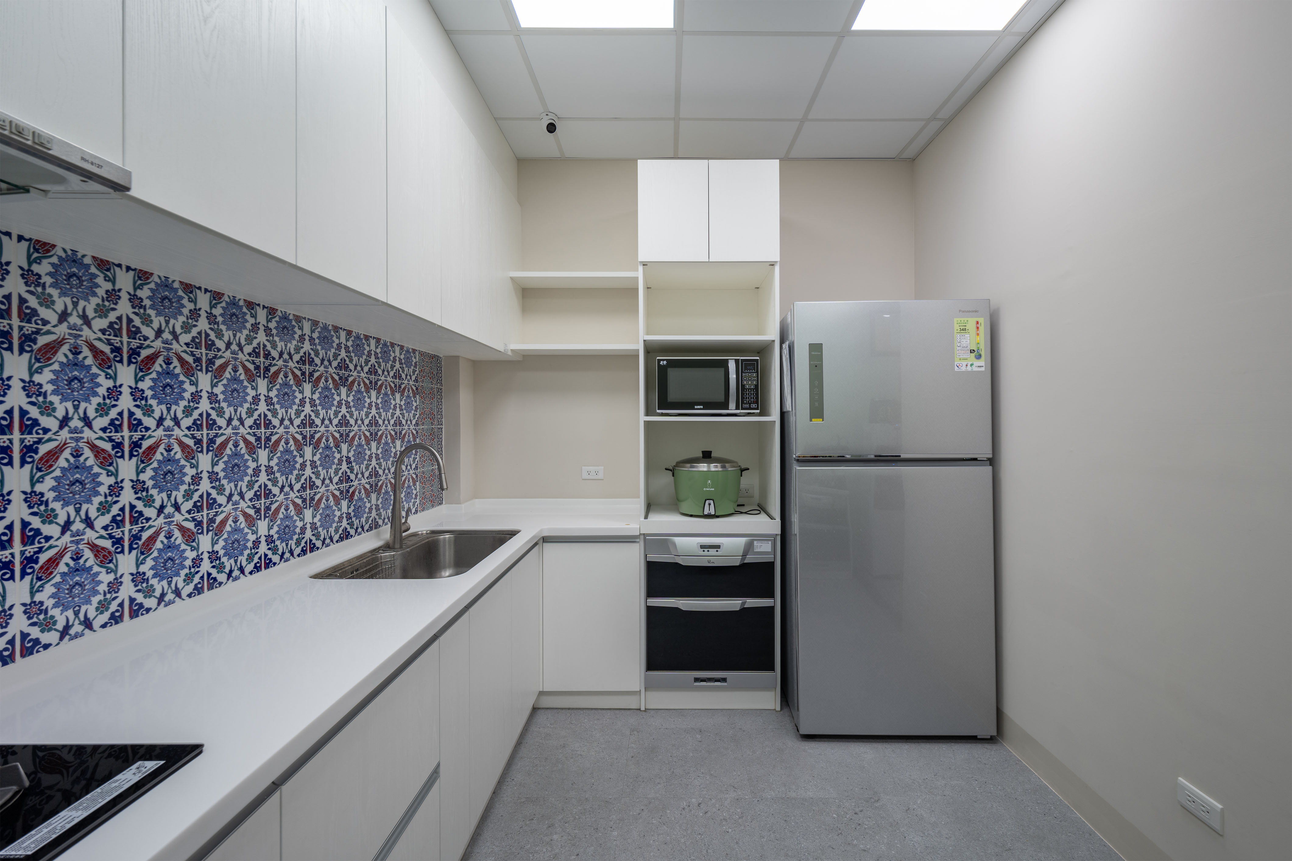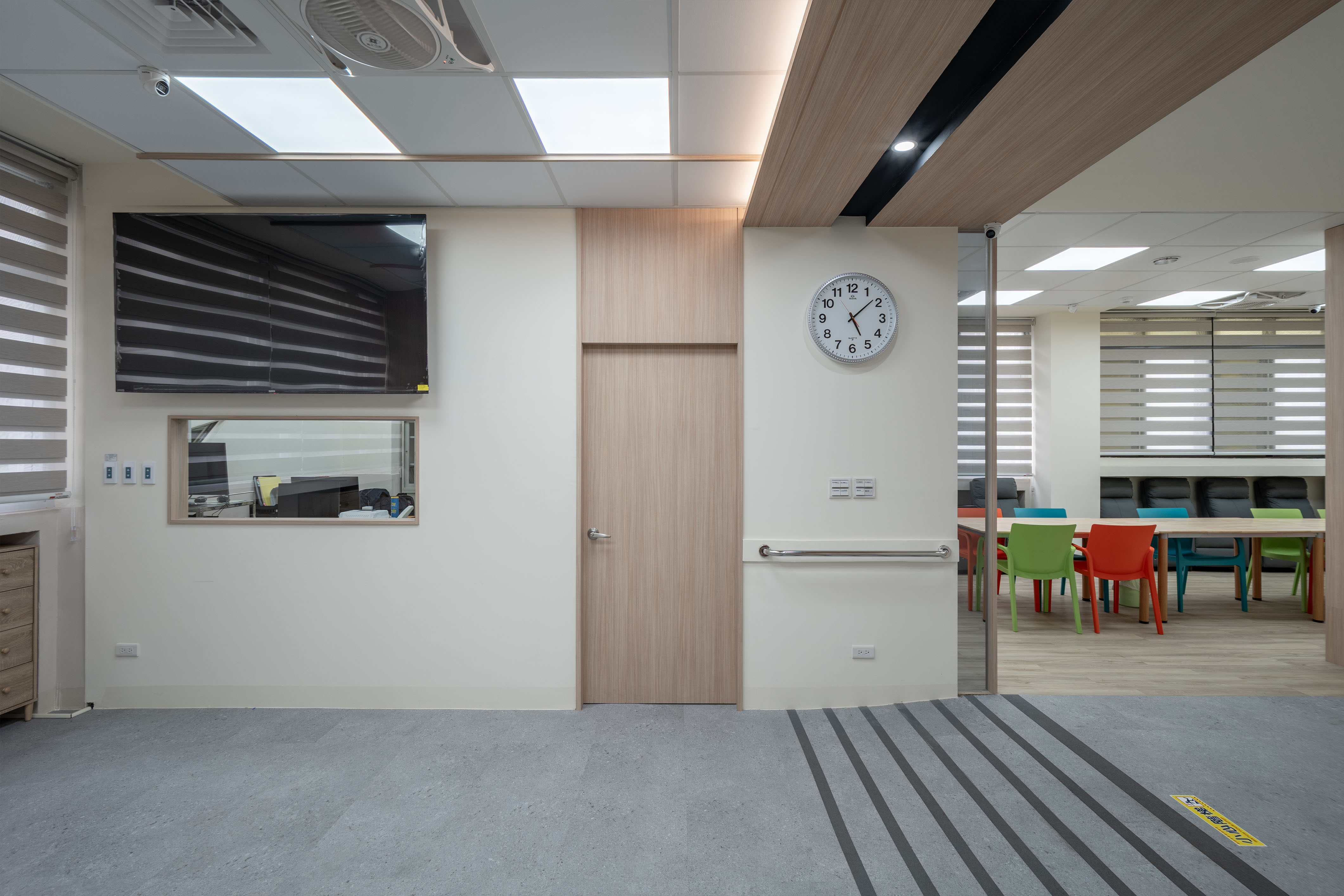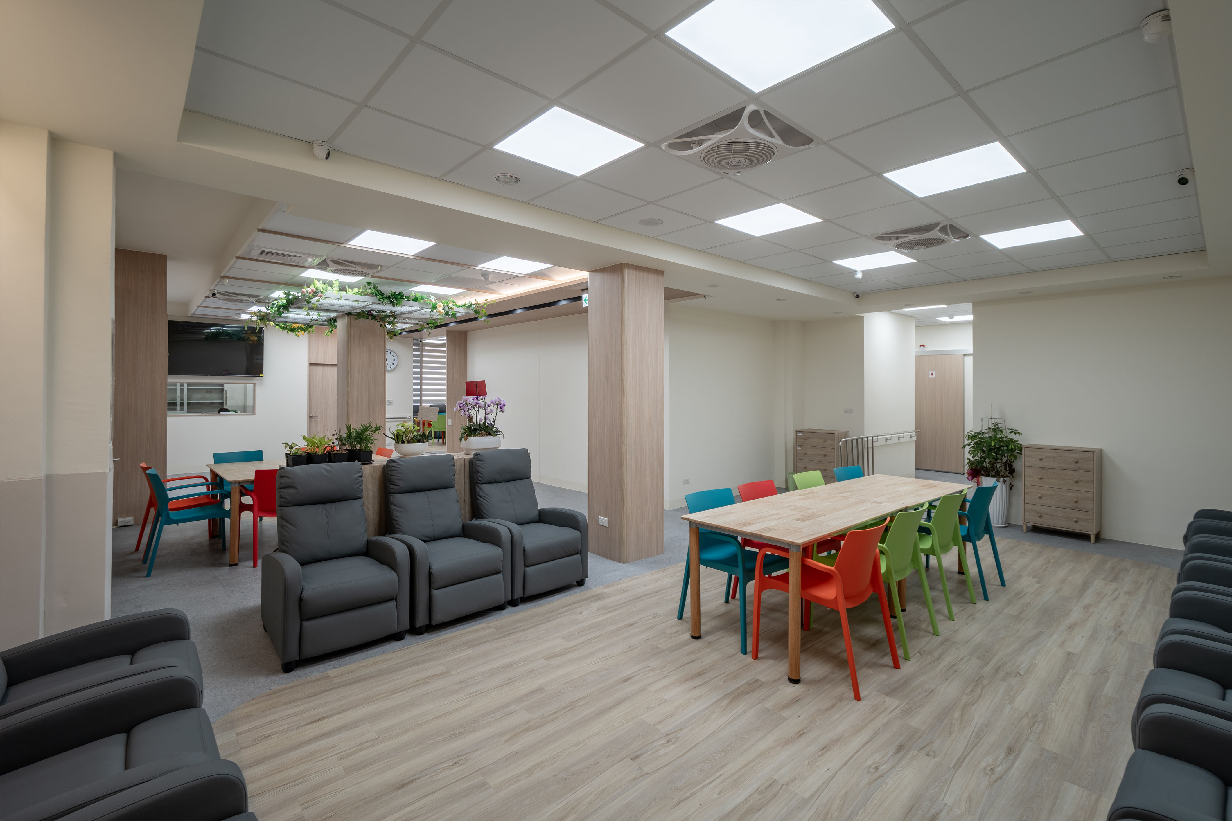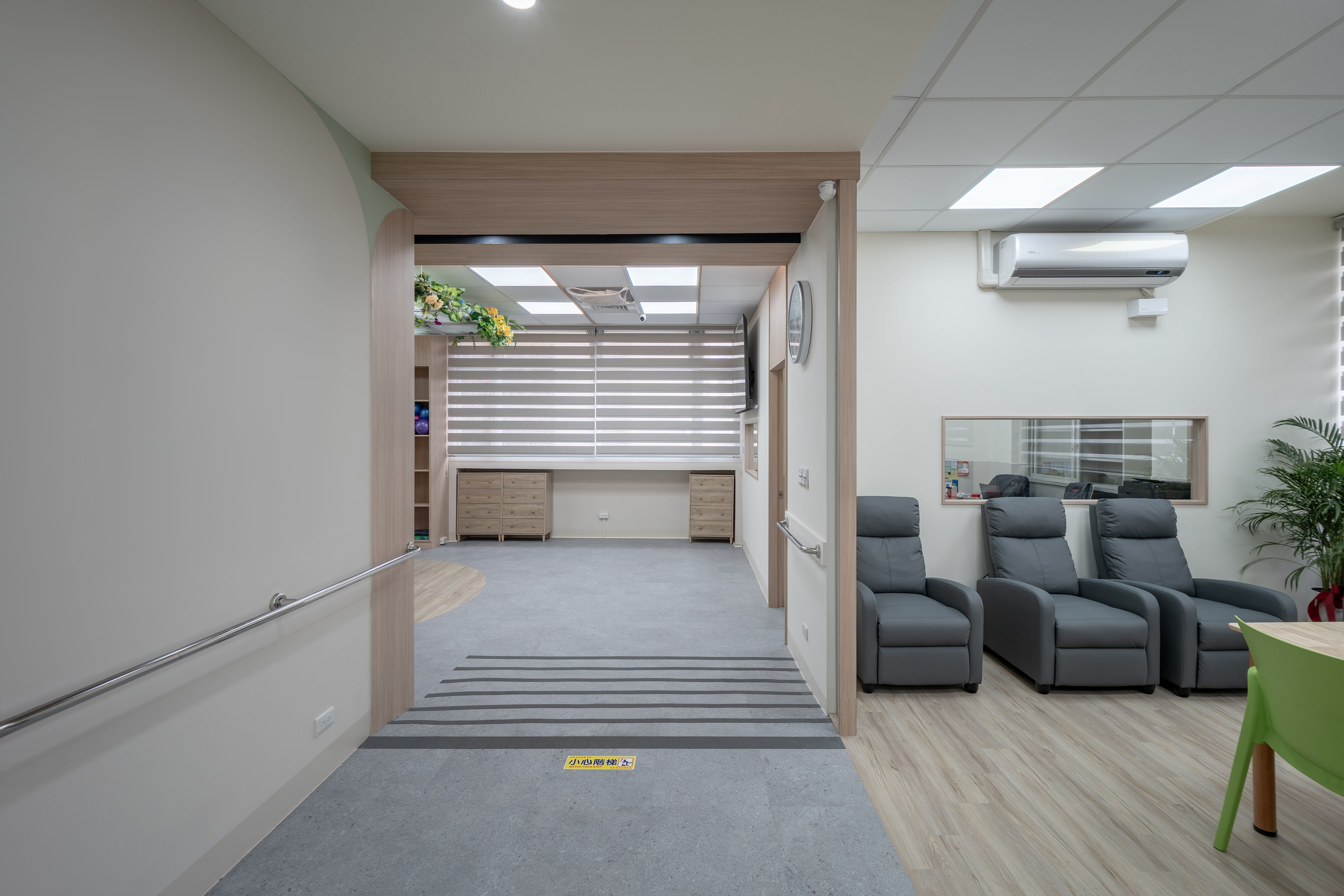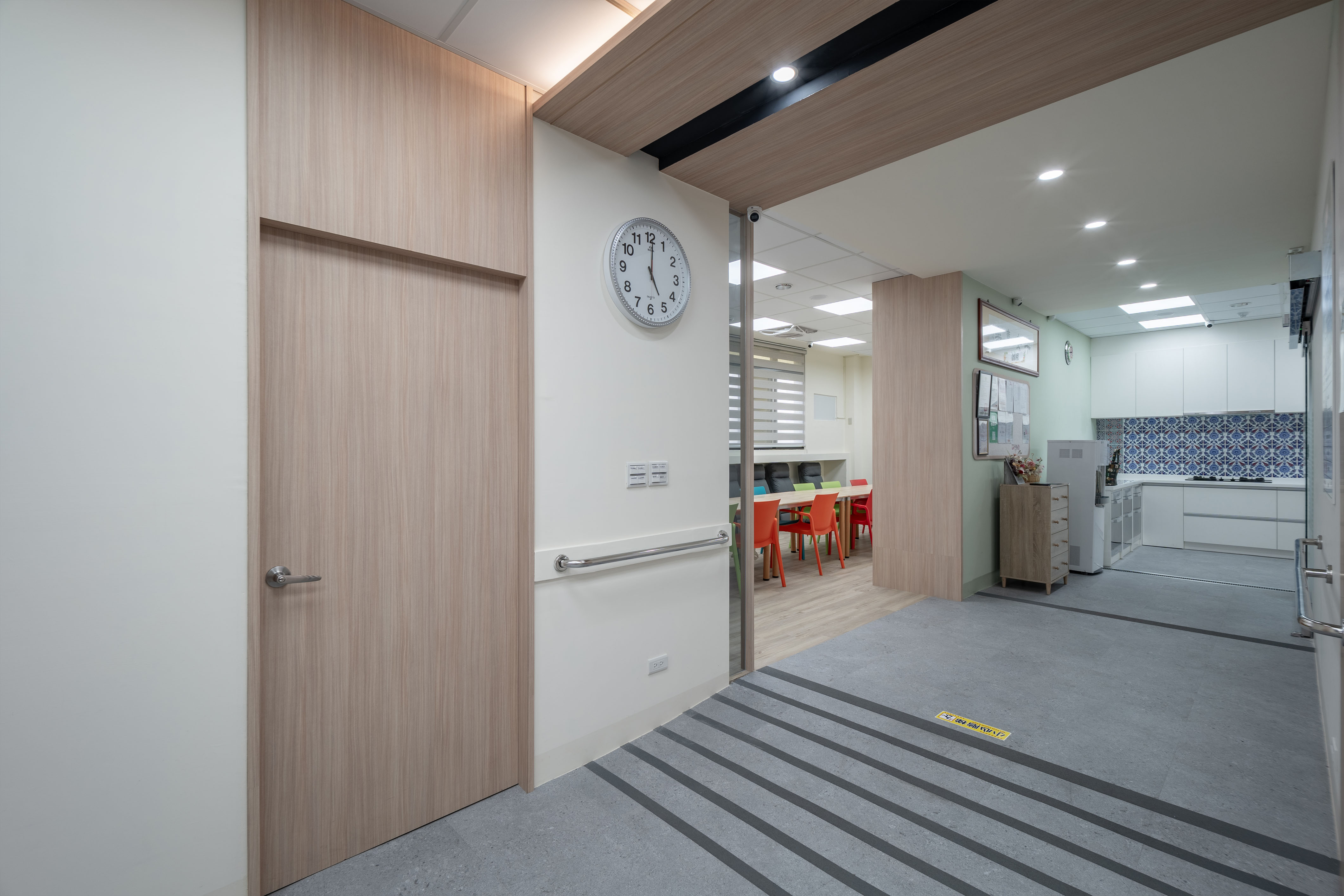 淺木紋 x 柔和白,營造寧靜舒適氛圍 格柵天花 x 綠植點綴,引入光影與綠意,增添生活溫度 木紋地坪 x 灰色地坪,清楚區分用餐、交誼、休息區,動線友善輪椅與助行器 白色廚櫃 x 西班牙花磚,打造乾淨明亮的廚房空間,喚起熟悉的「家的味道」 【設計師】李嘉翎‧Lily Lee、張濬富‧Ryan Chang