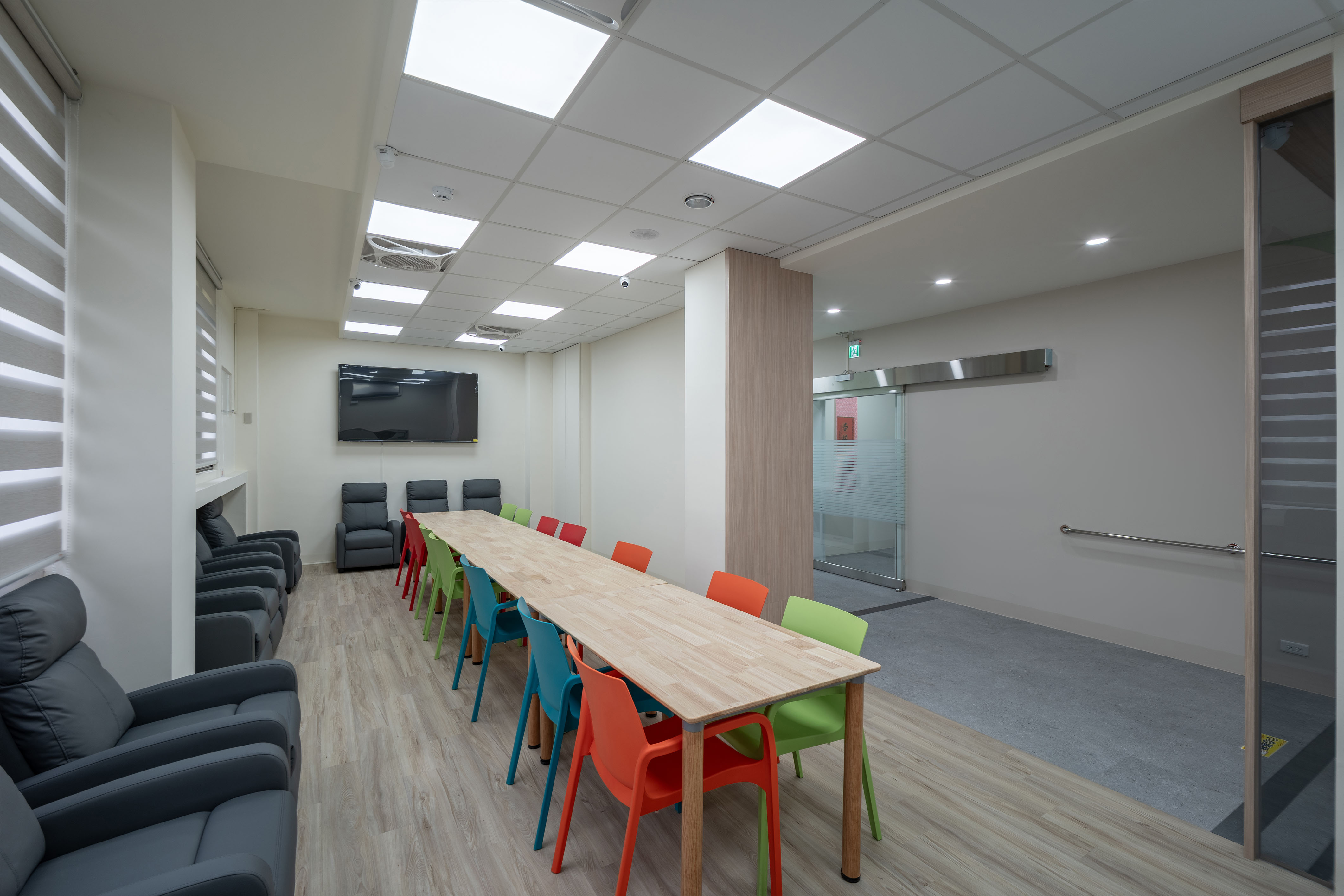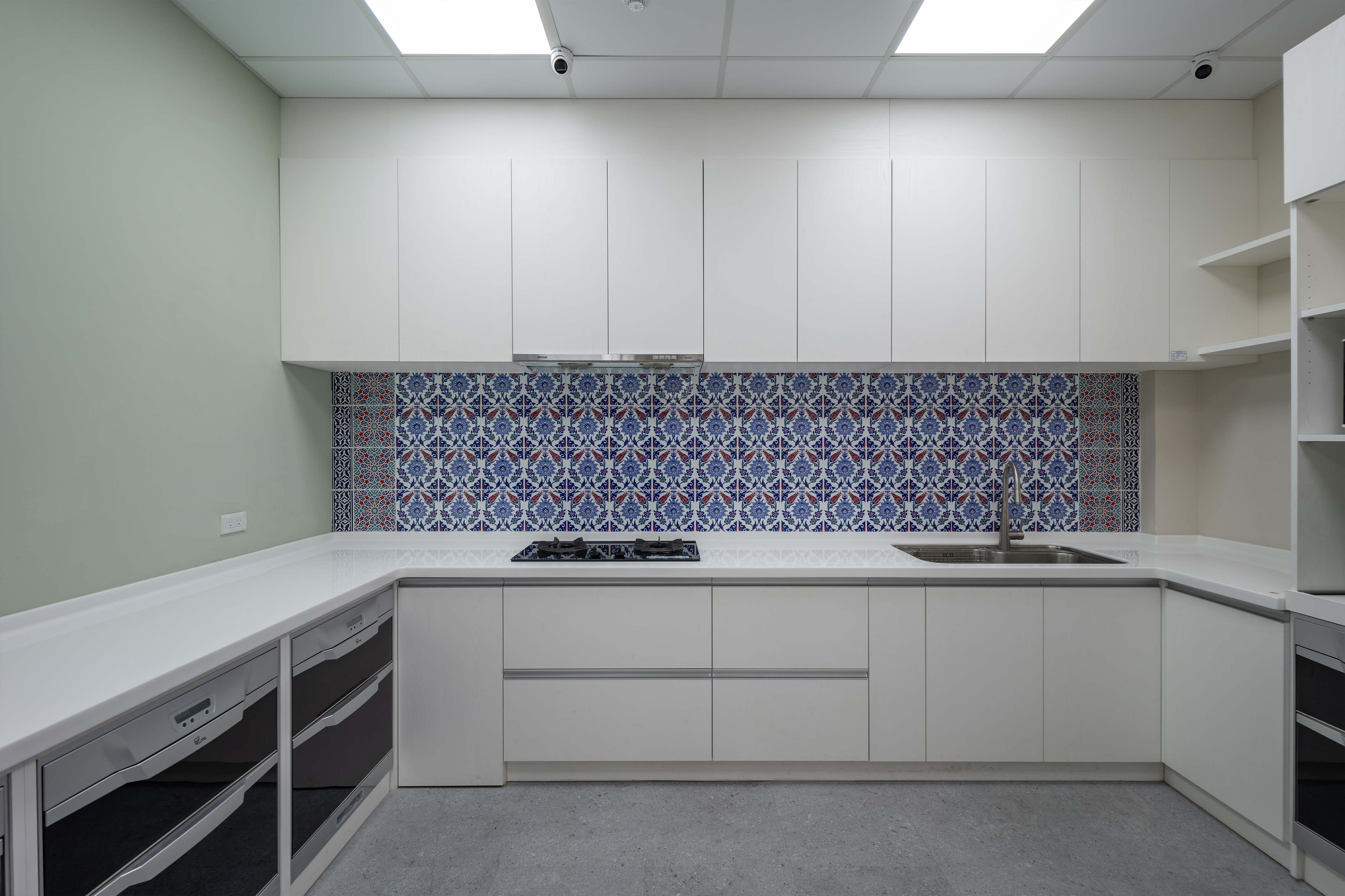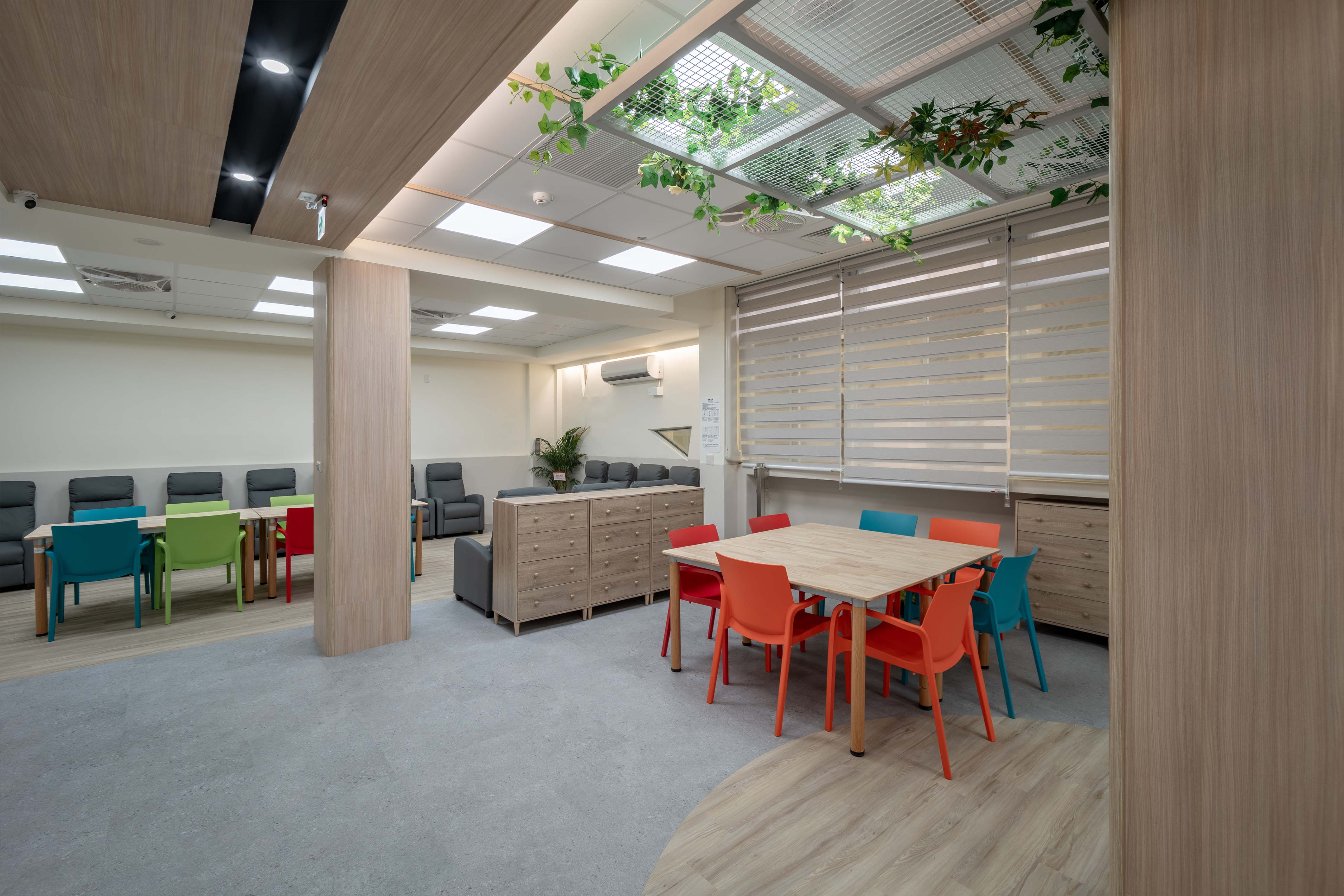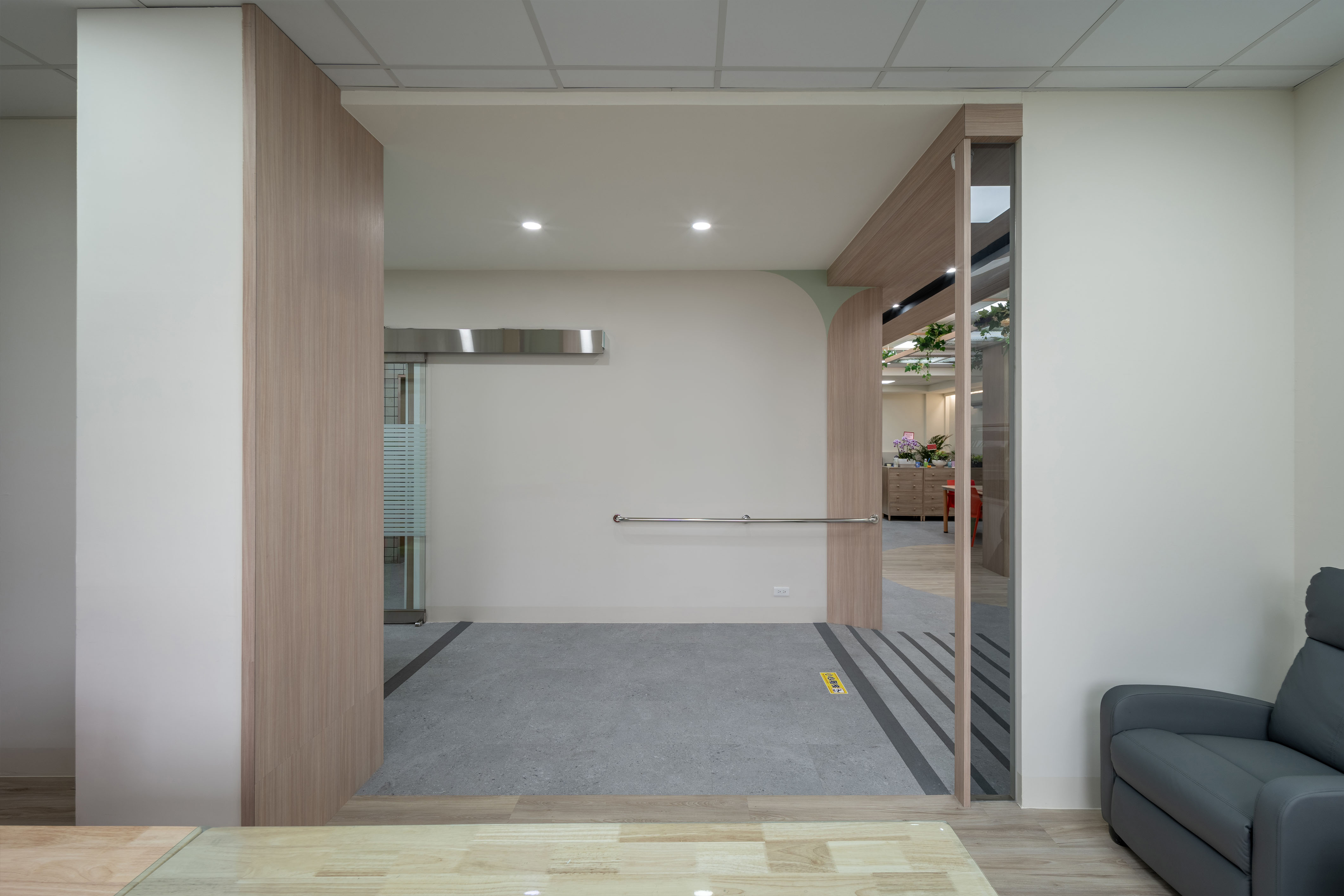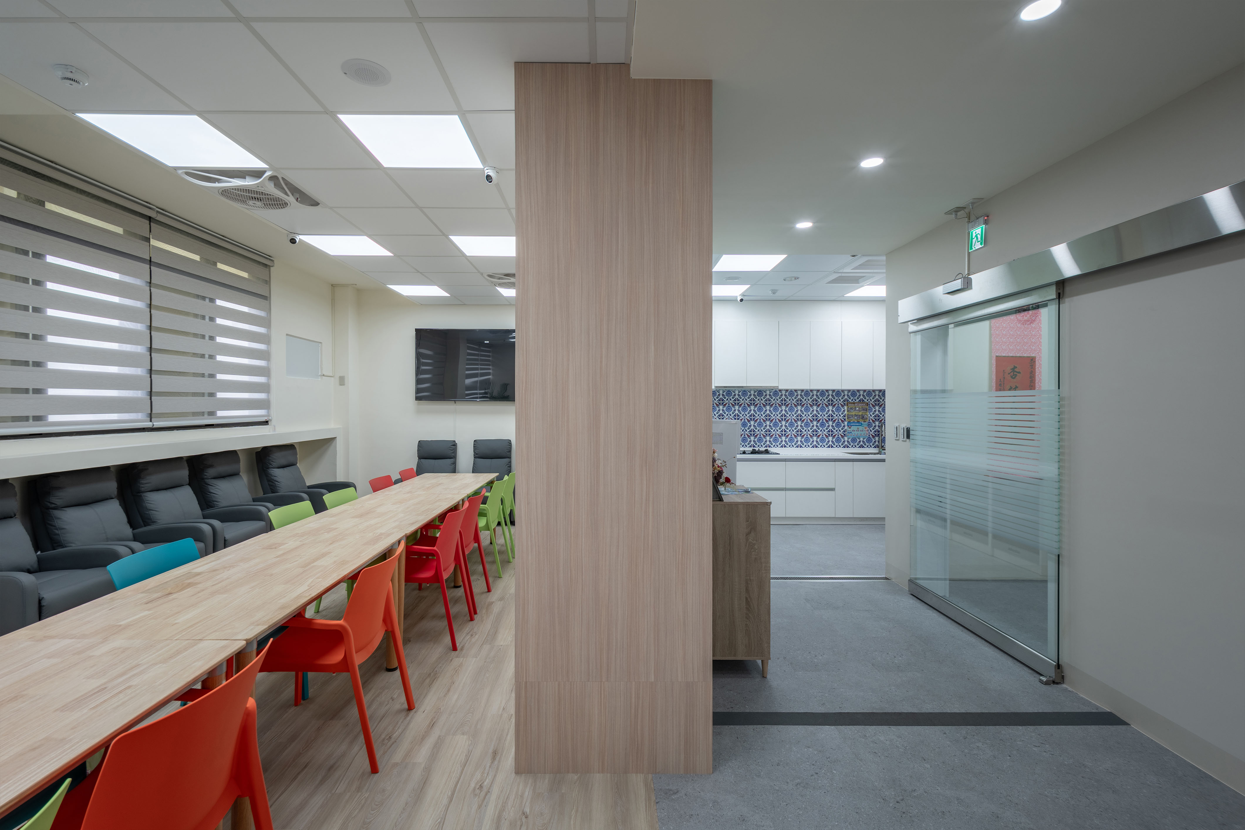 淺木紋 x 柔和白,營造寧靜舒適氛圍 格柵天花 x 綠植點綴,引入光影與綠意,增添生活溫度 木紋地坪 x 灰色地坪,清楚區分用餐、交誼、休息區,動線友善輪椅與助行器 白色廚櫃 x 西班牙花磚,打造乾淨明亮的廚房空間,喚起熟悉的「家的味道」 【設計師】李嘉翎‧Lily Lee、張濬富‧Ryan Chang