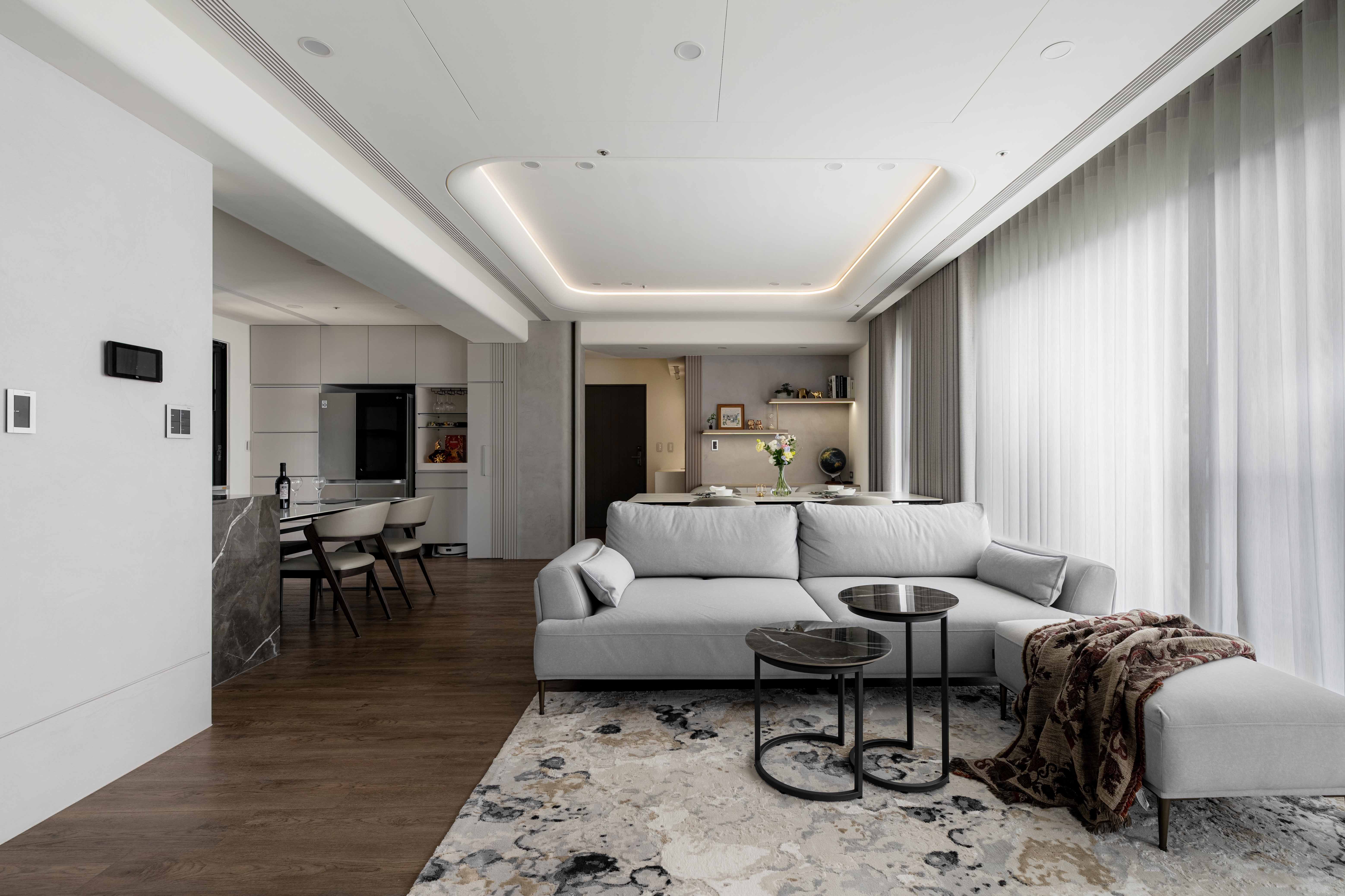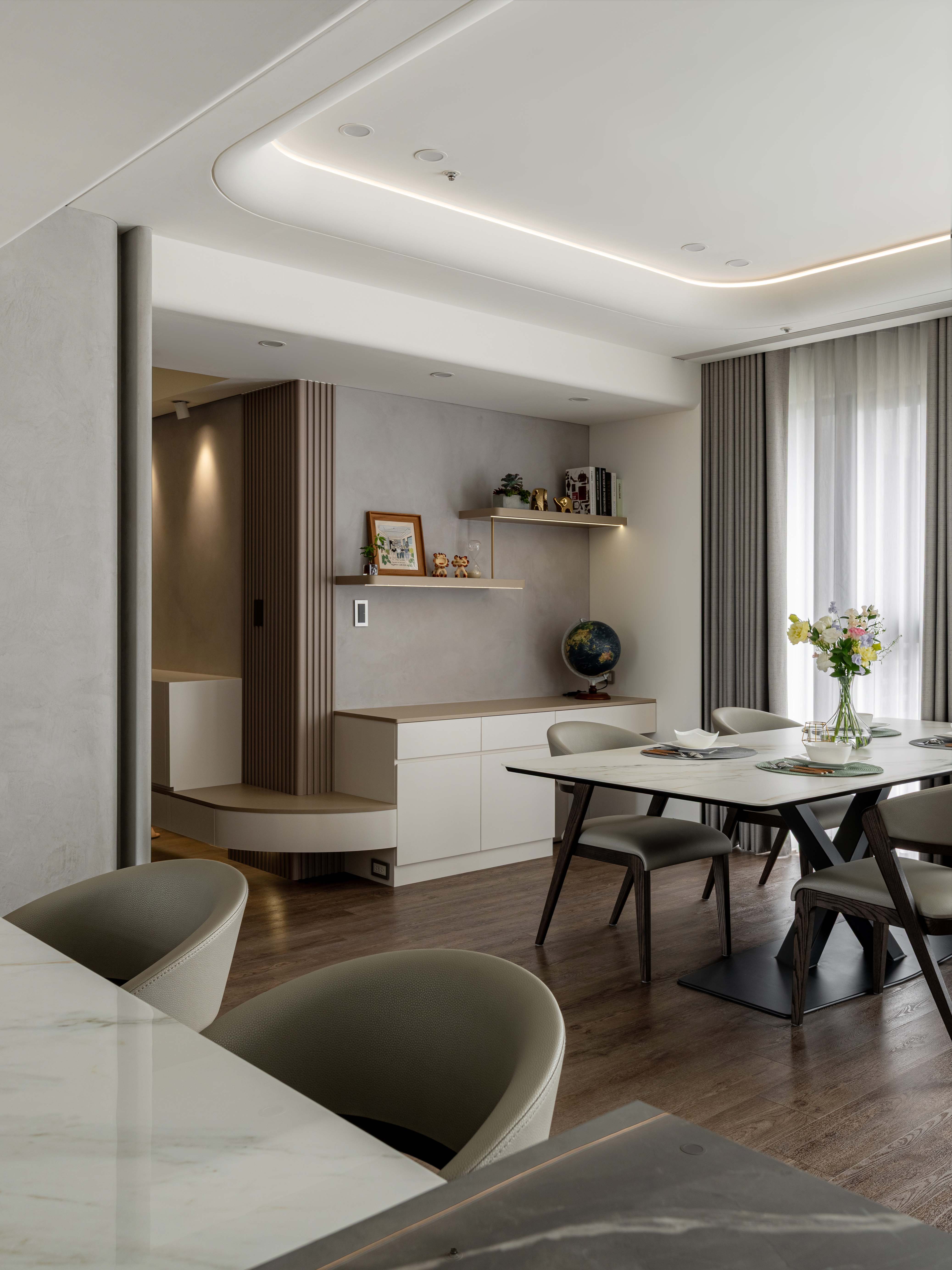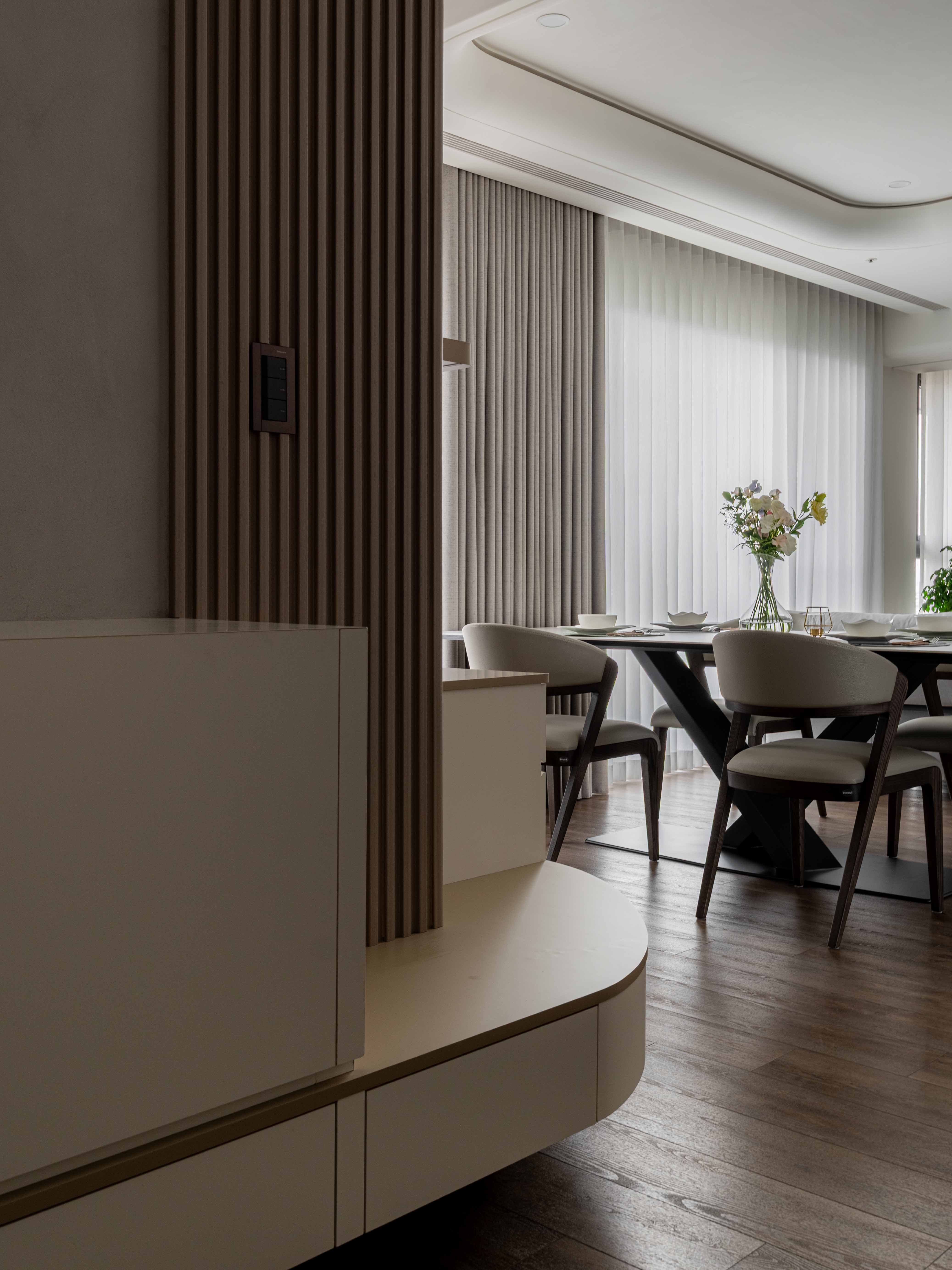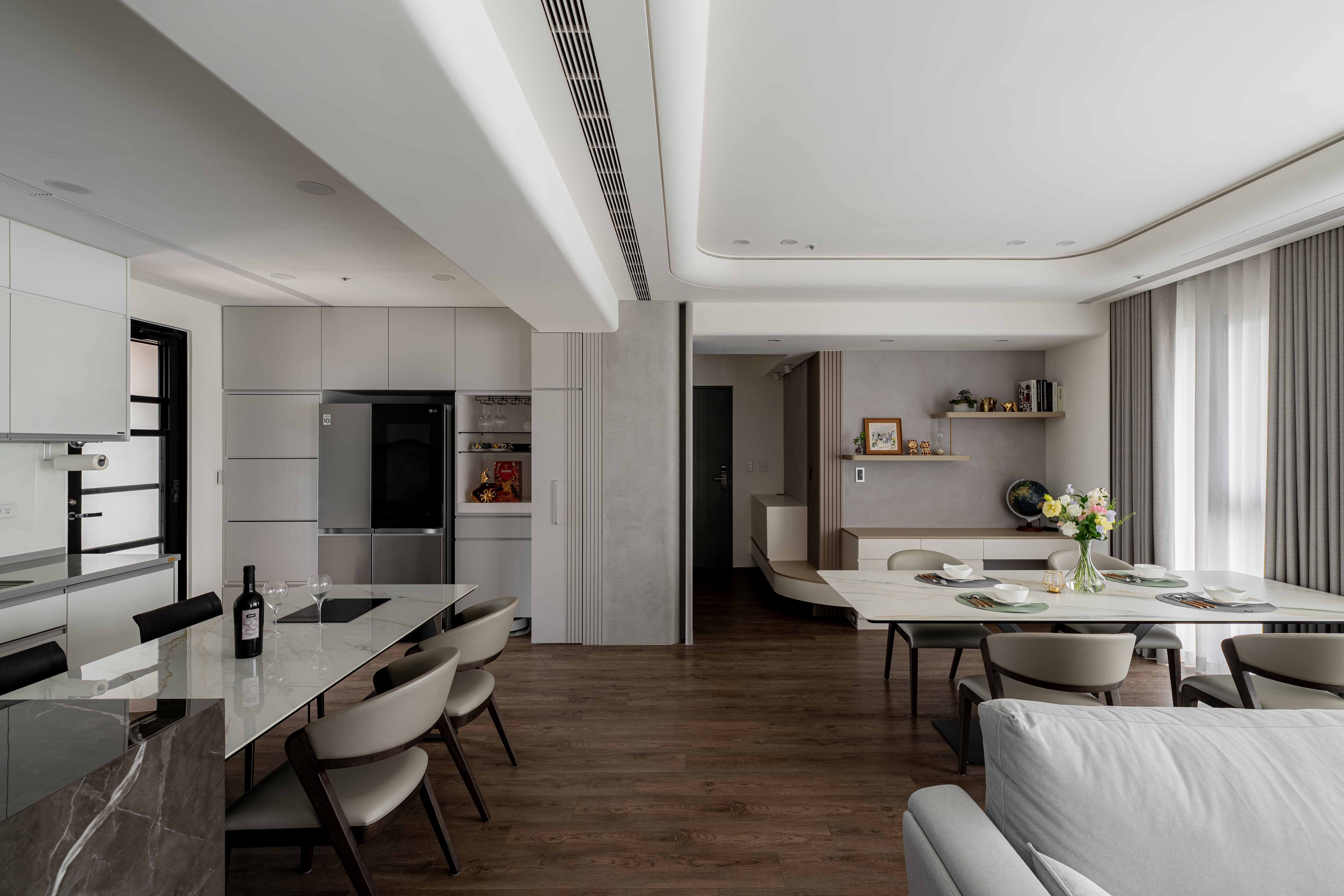 《輕奢慢居》 |室內坪數|30坪 |空間格局|2房2衛2廳1開放式廚房 |建築屋況|新成屋 透過弧形天花修飾樑柱,柔化結構線條,讓空間視線自然流動 在曲線與光影層次中,形塑沉穩而有溫度的氛圍 ✧ 設計主任:呂亮瑩‧Cora Lu ✧ 設計師:陳玉真Kim Chen