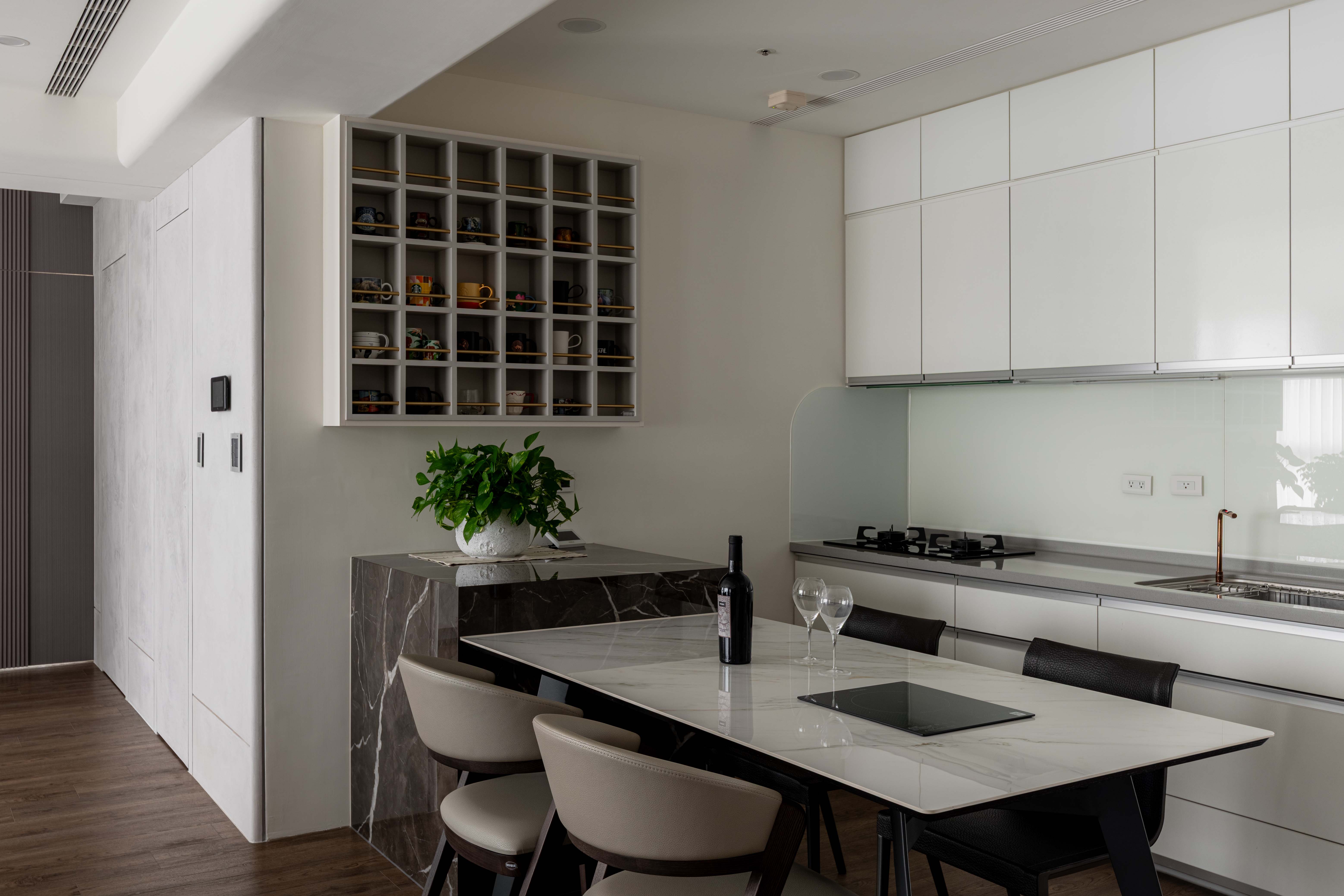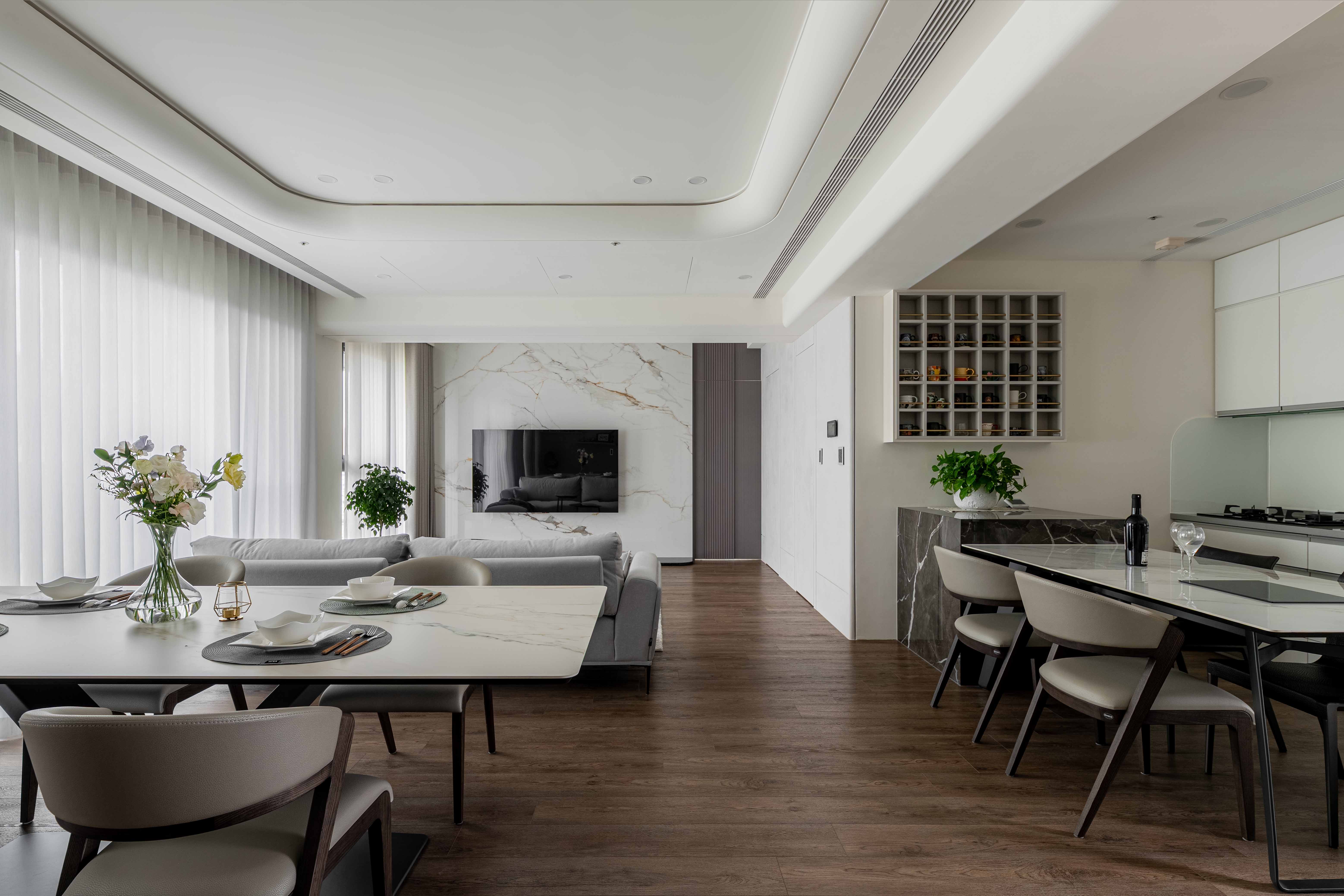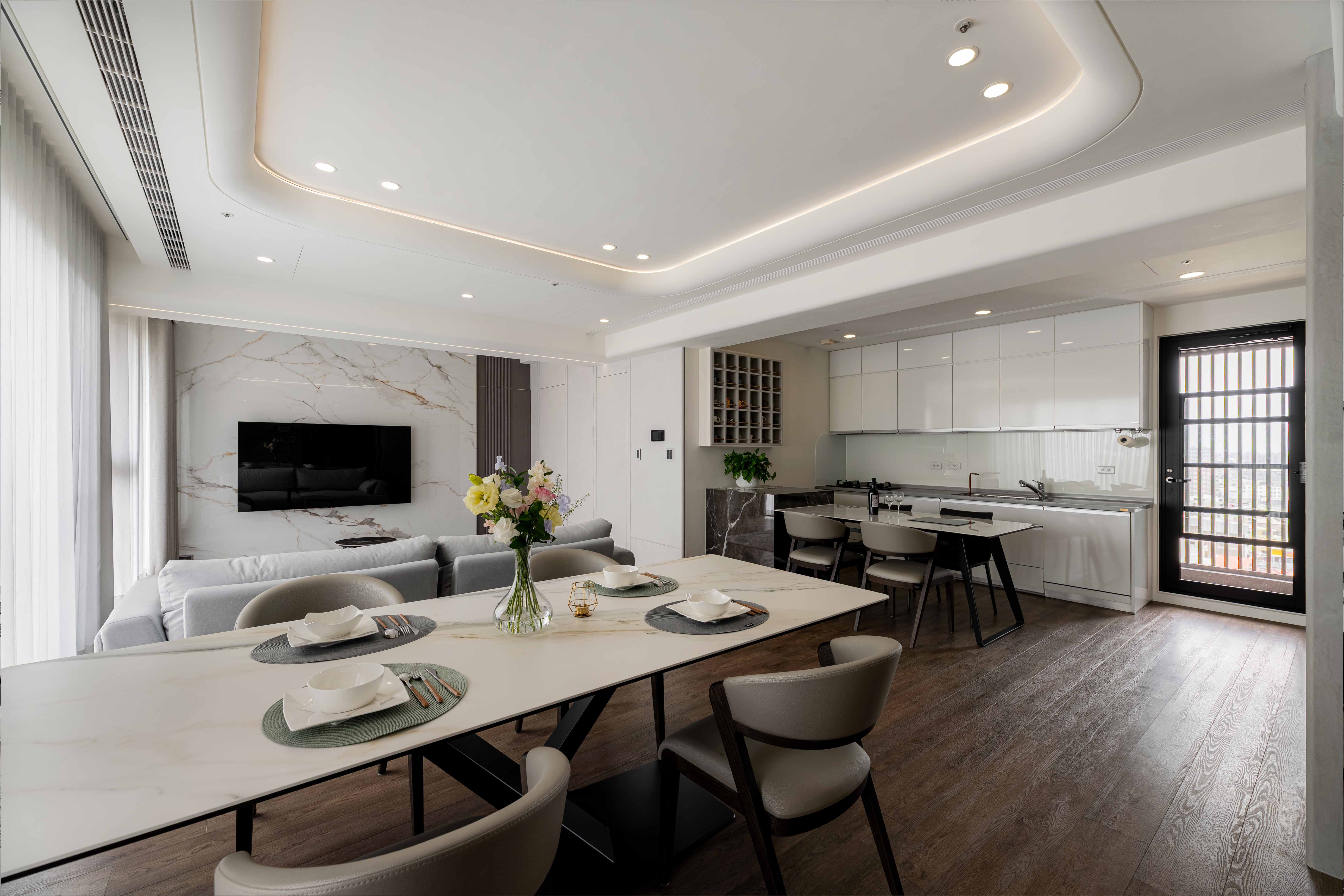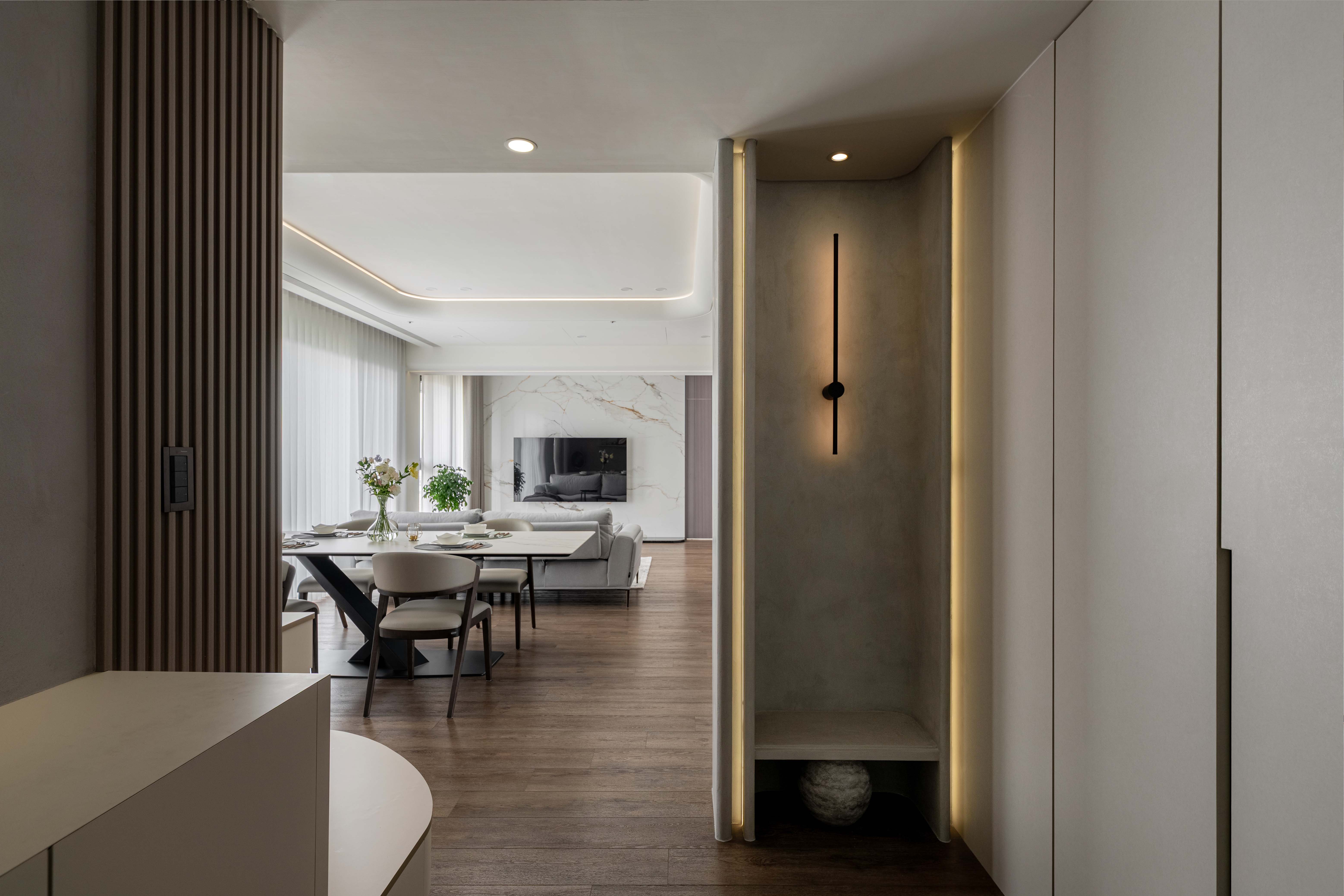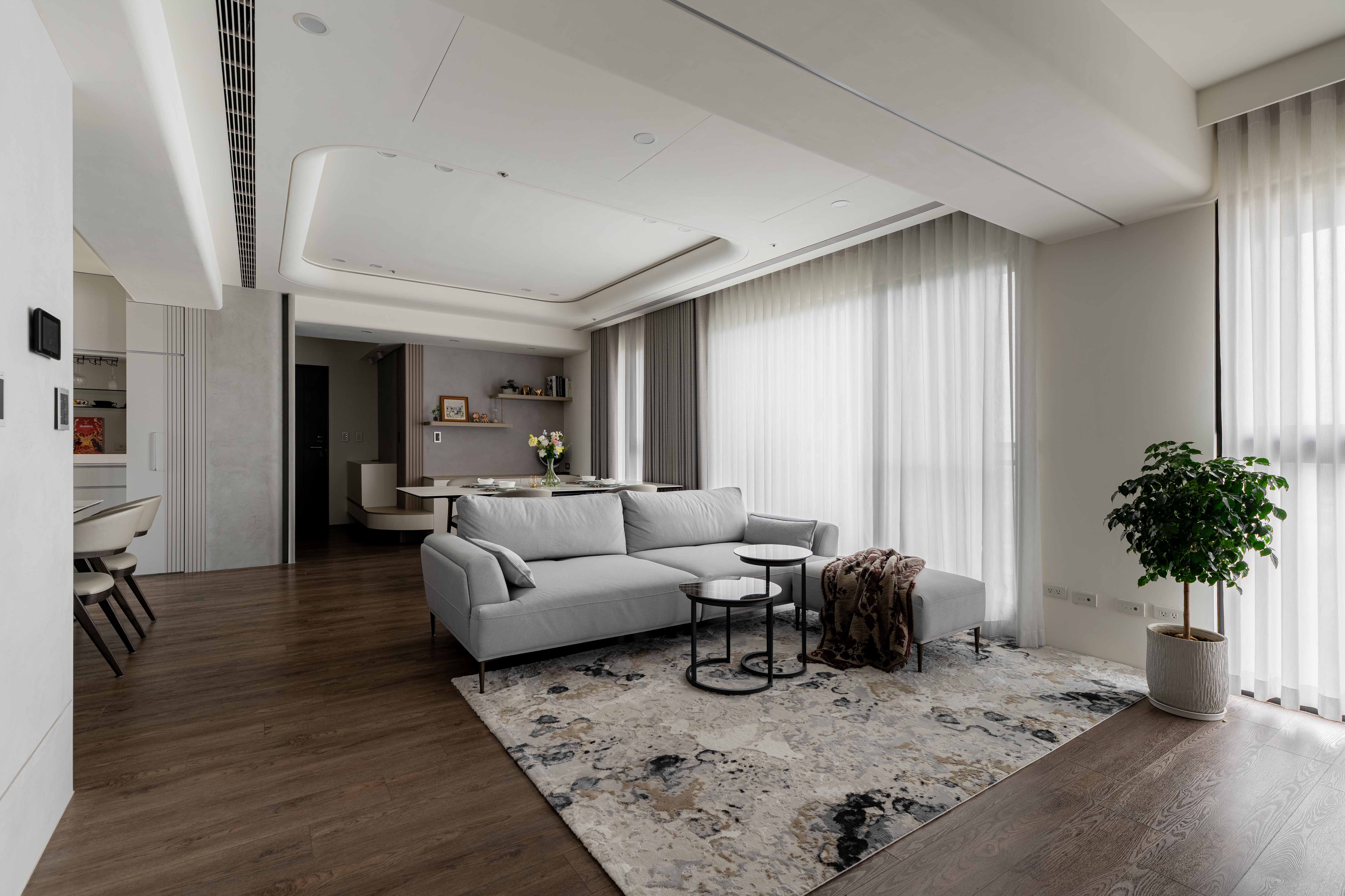 《輕奢慢居》 |室內坪數|30坪 |空間格局|2房2衛2廳1開放式廚房 |建築屋況|新成屋 透過弧形天花修飾樑柱,柔化結構線條,讓空間視線自然流動 在曲線與光影層次中,形塑沉穩而有溫度的氛圍 ✧ 設計主任:呂亮瑩‧Cora Lu ✧ 設計師:陳玉真Kim Chen