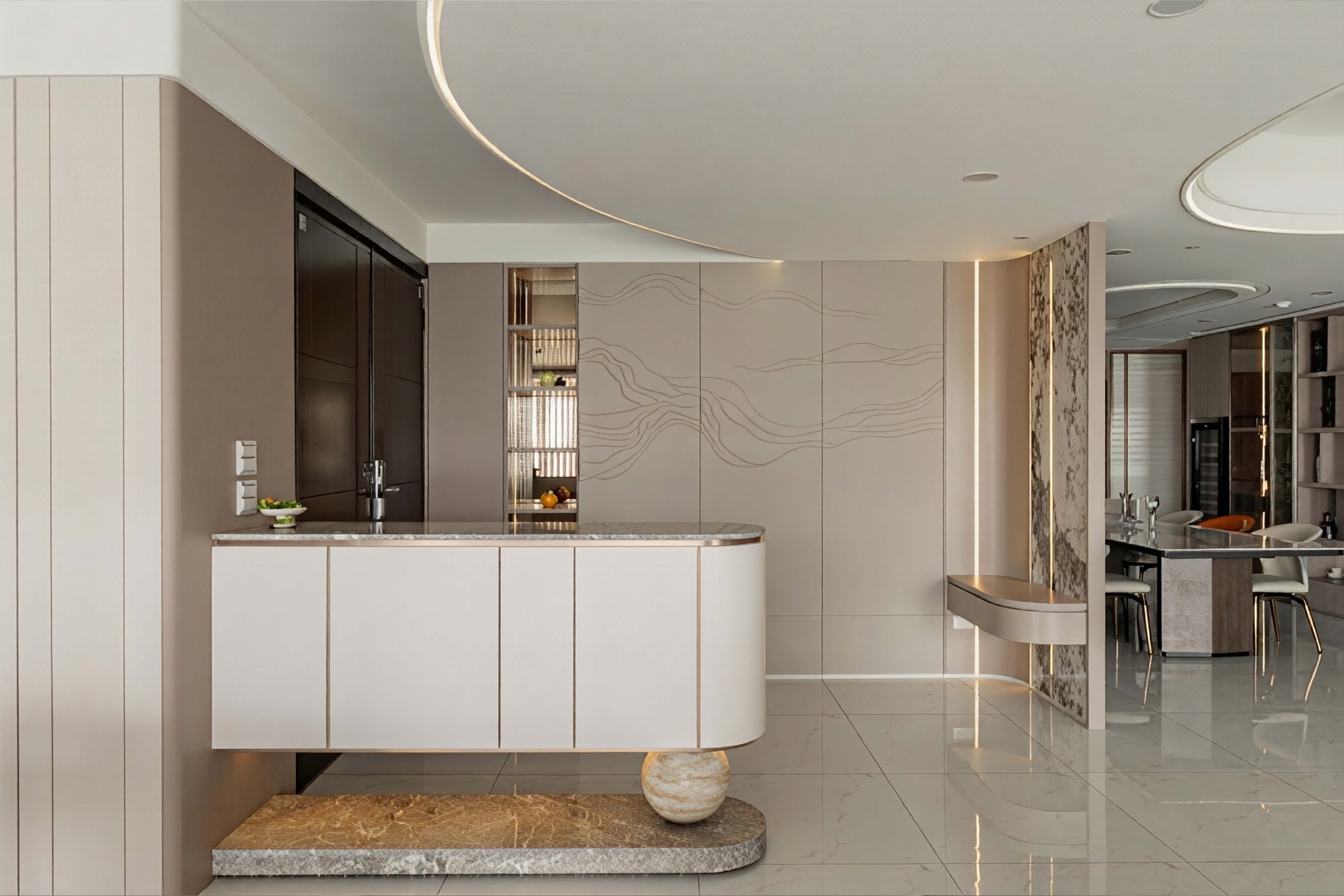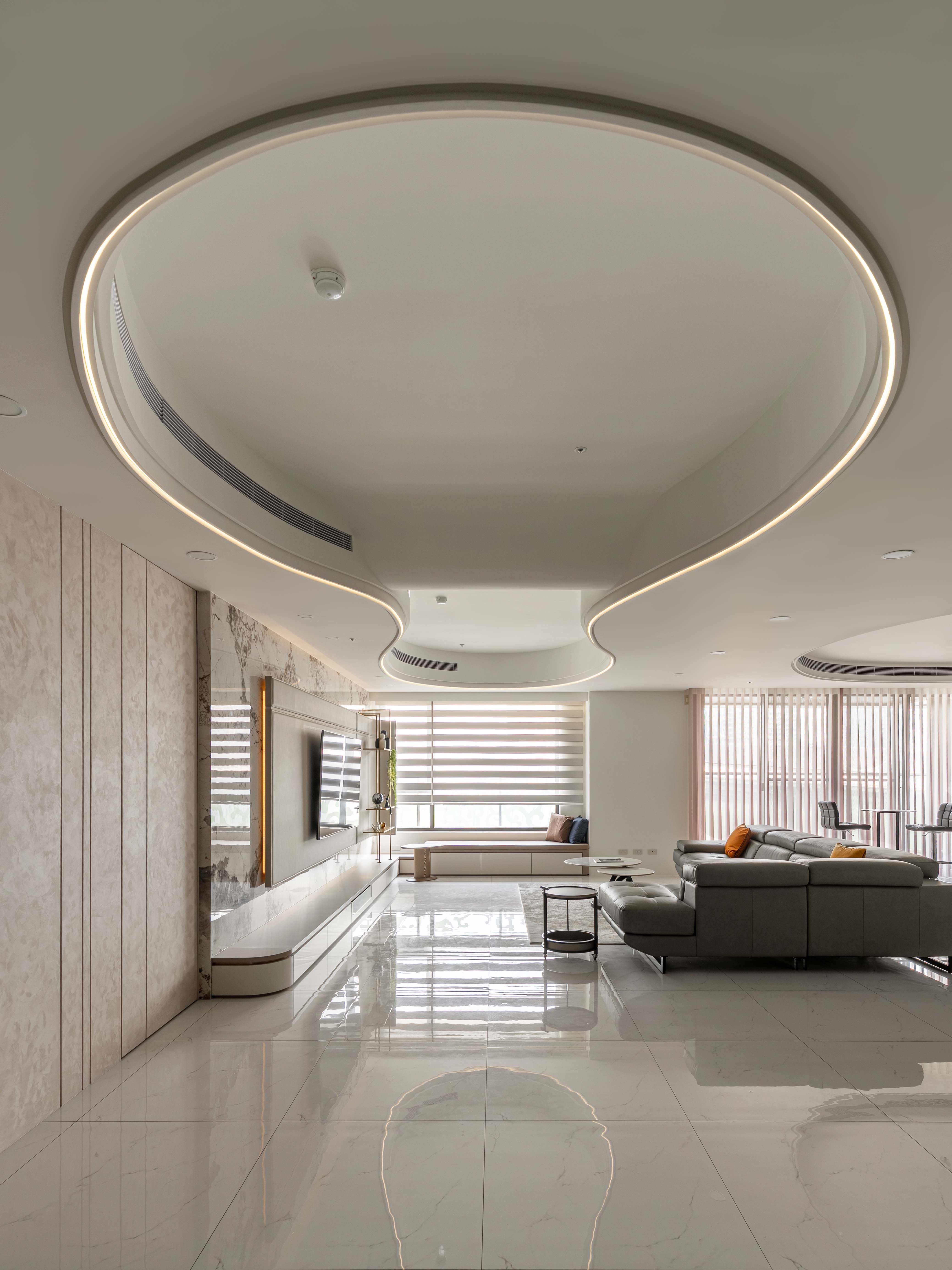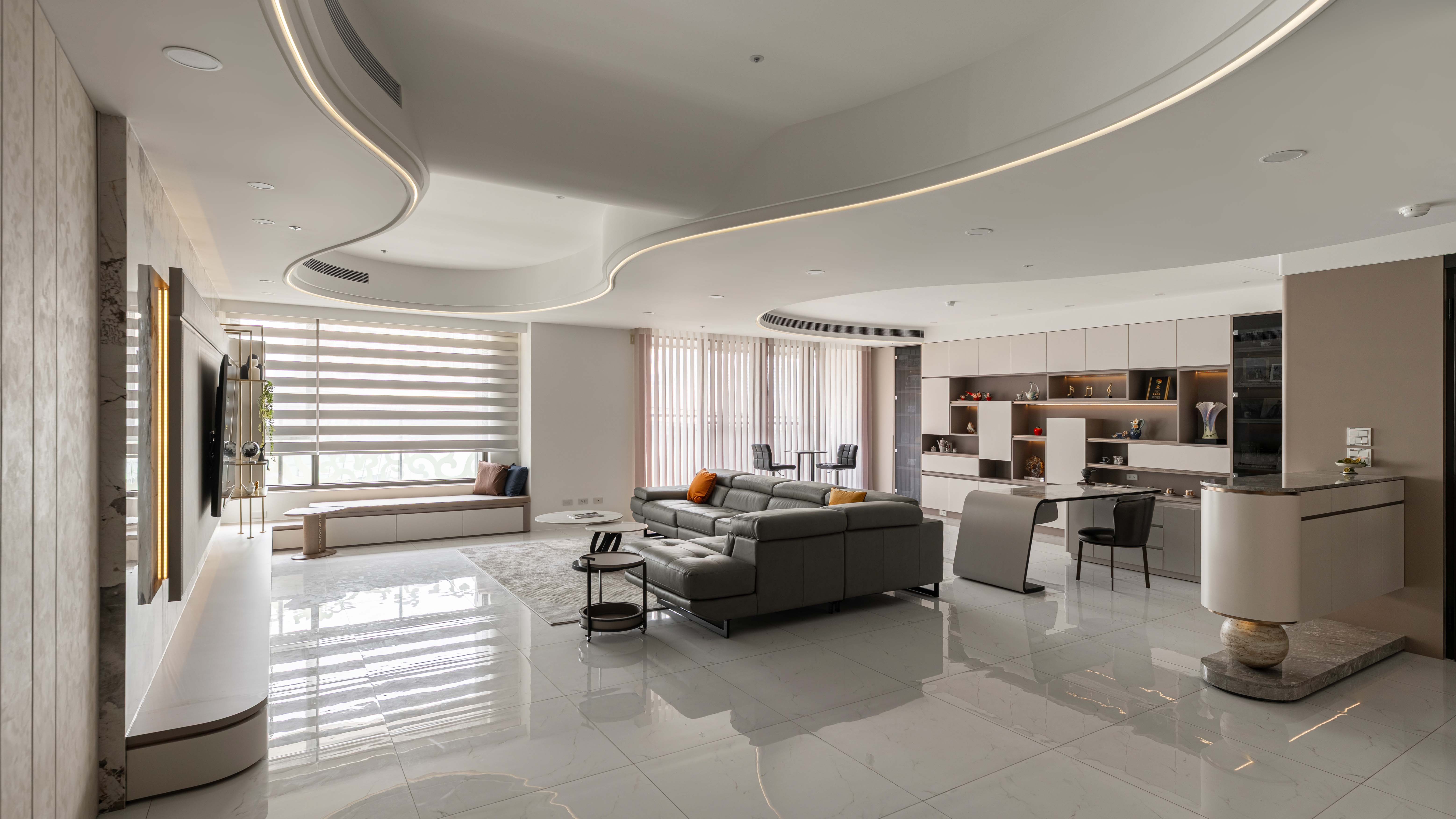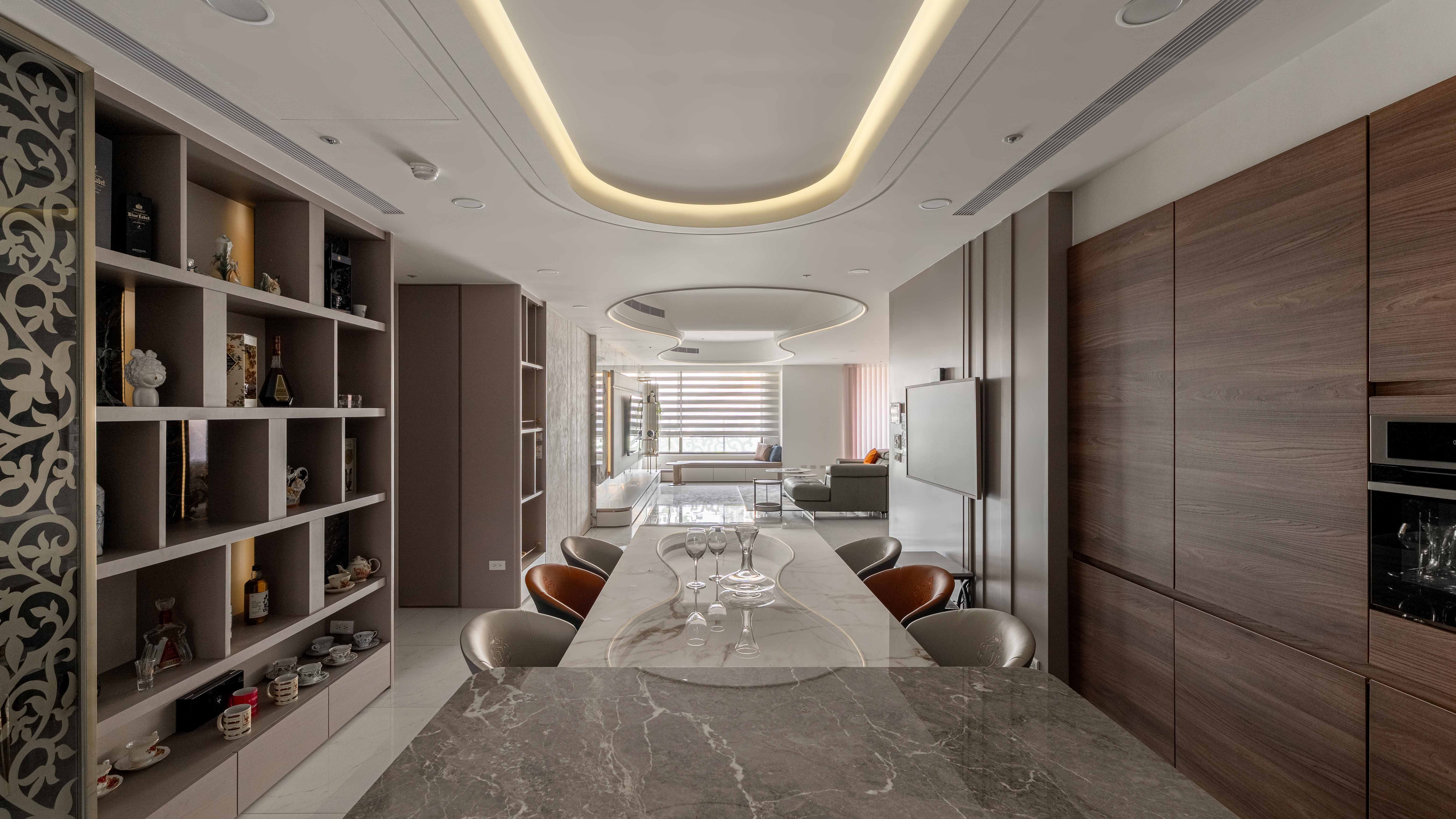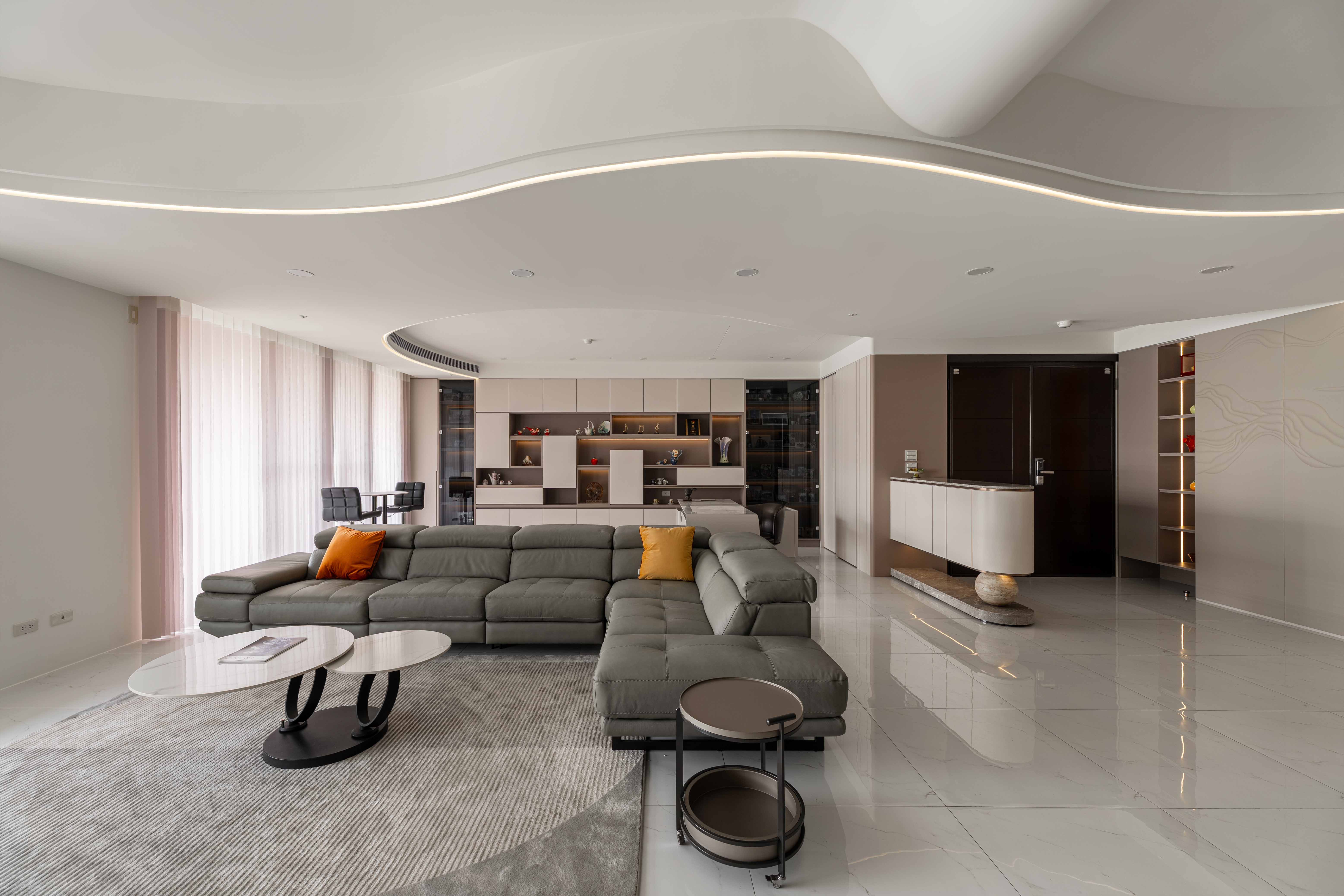 面對室內不可避開的大型橫樑,我們屏棄傳統封板的冷硬,改以「漣漪」為靈感。透過多層次波浪曲線天花導角,優雅地克服壓樑問題,更讓視覺隨燈帶律動,將原本生硬的結構「化剛為柔」,轉化為空間中最大器的藝術亮點