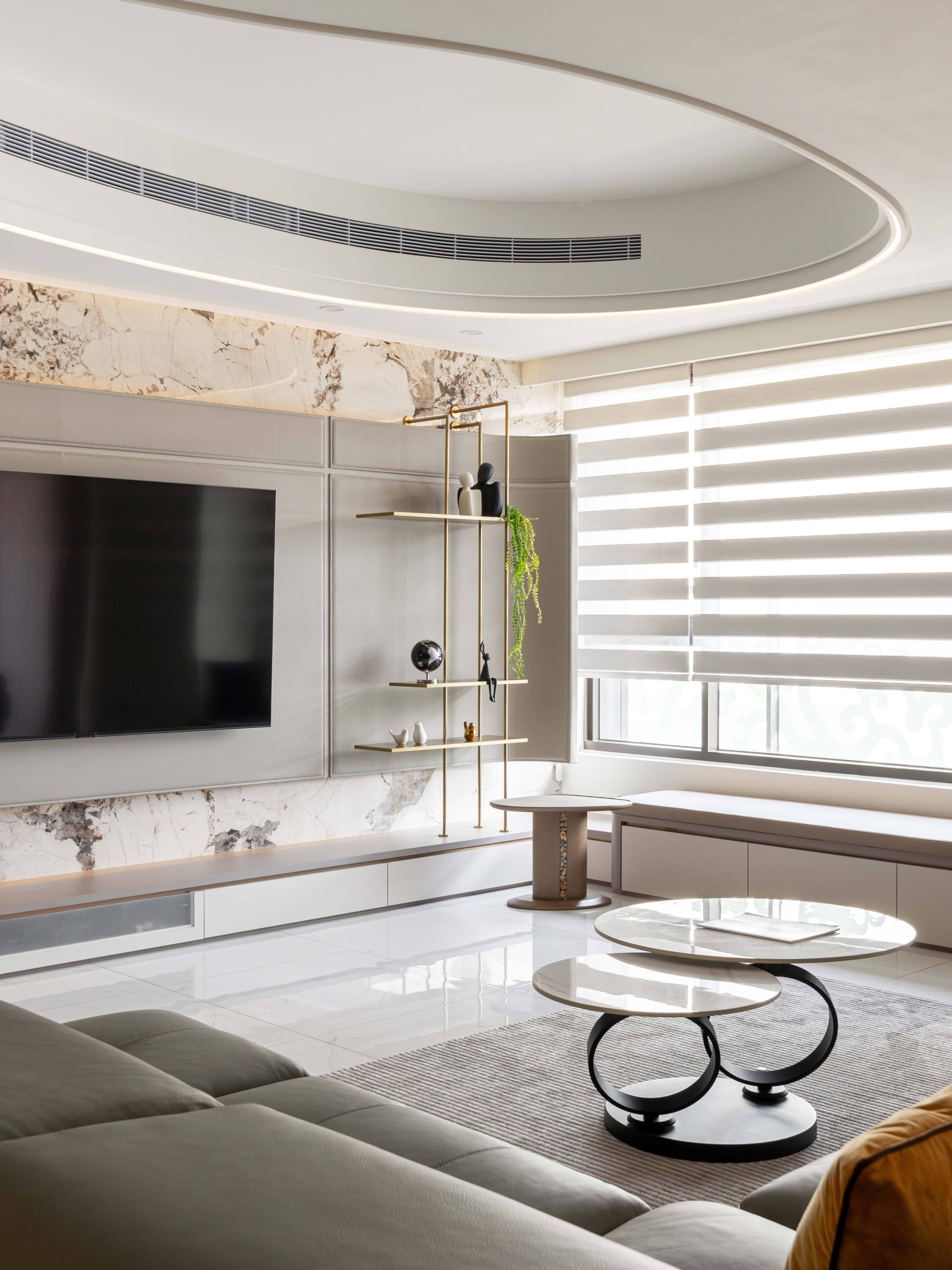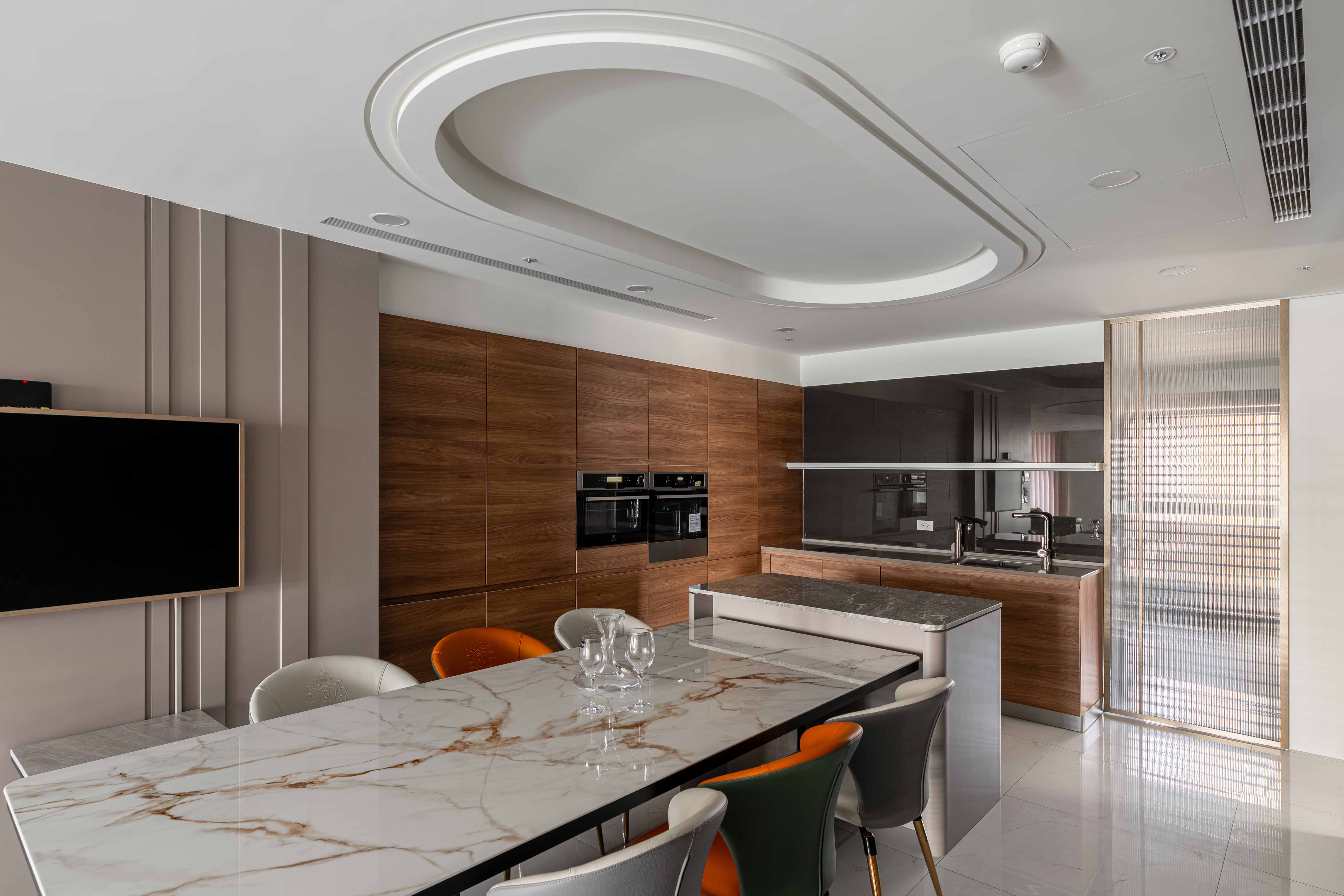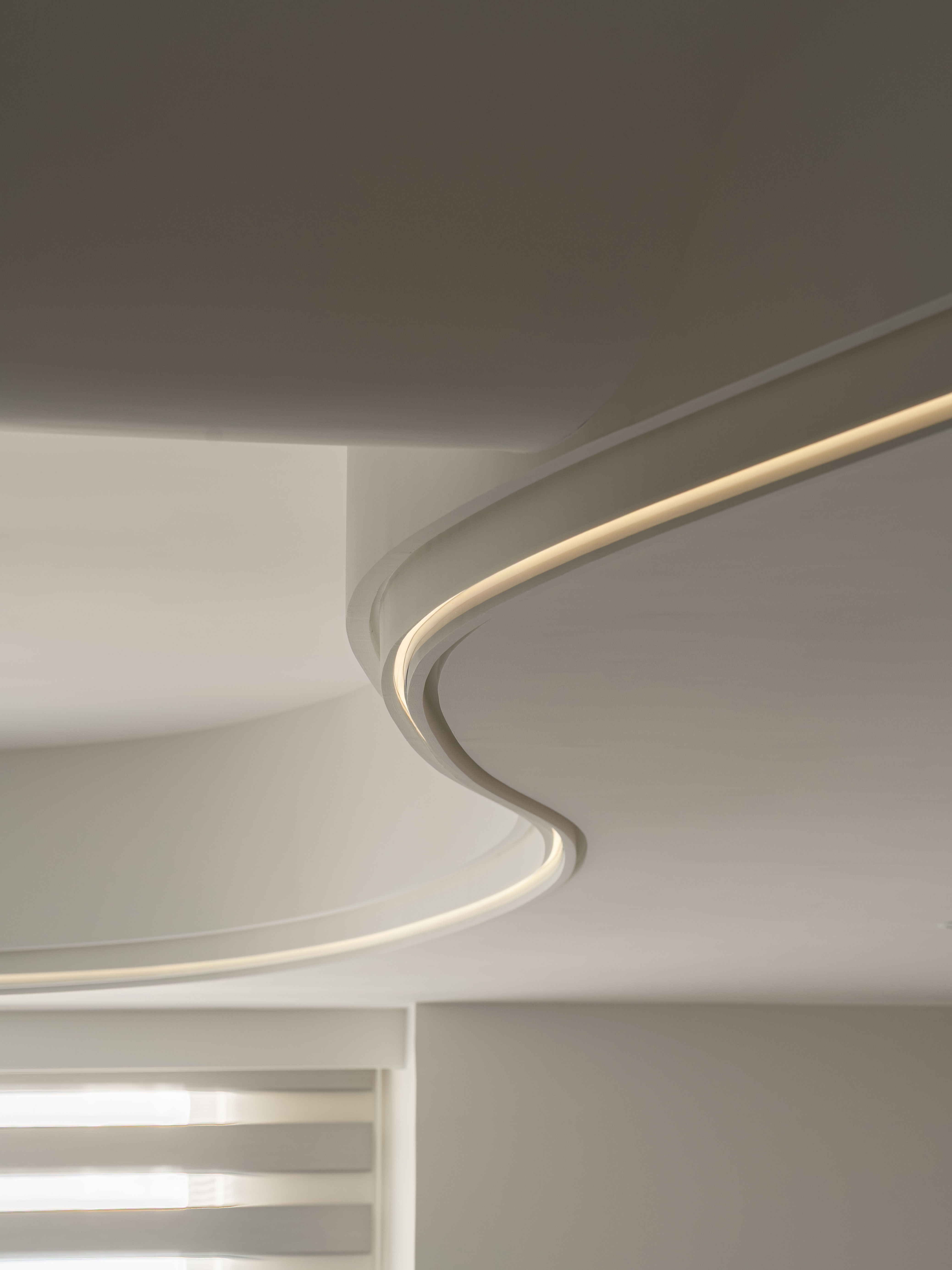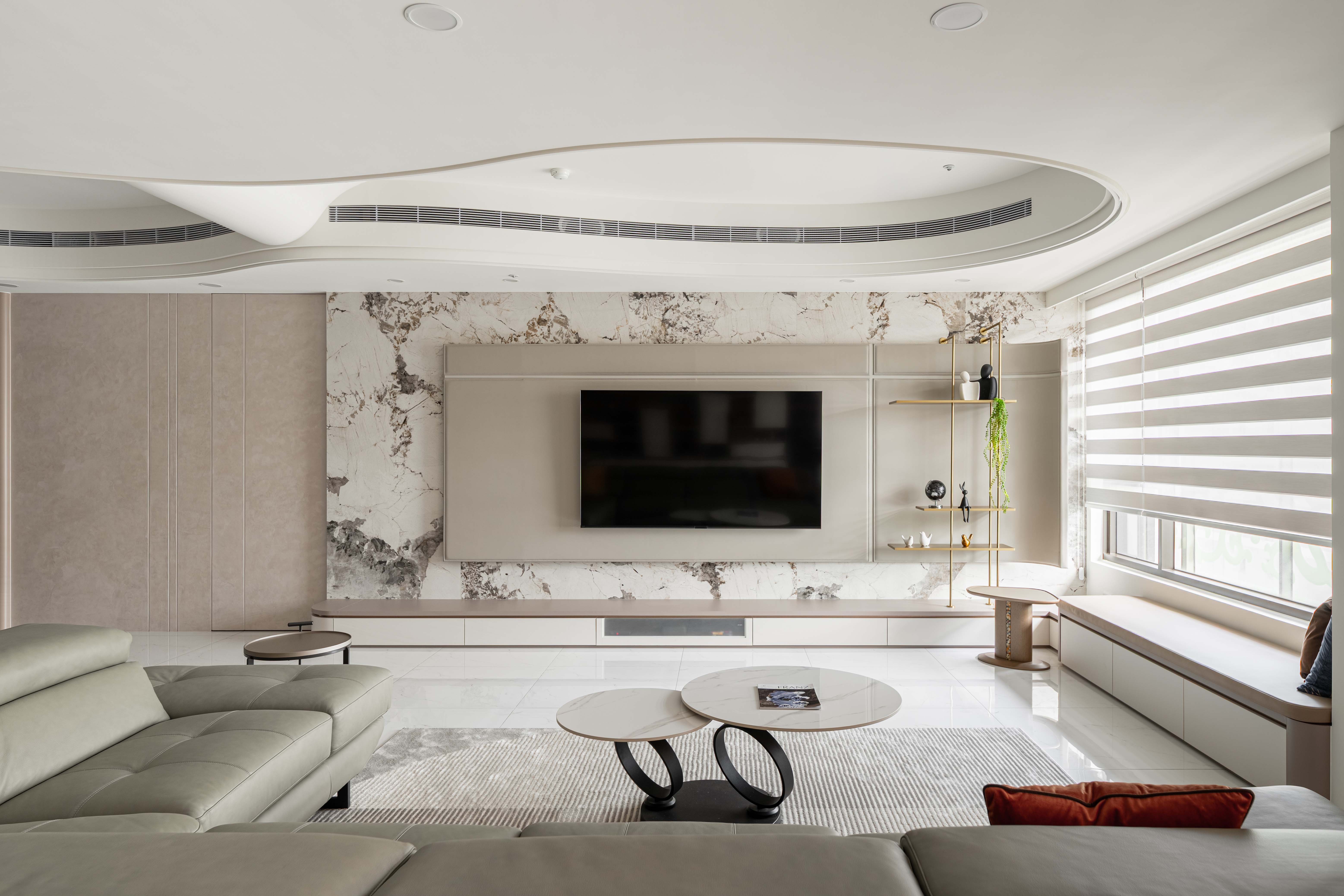 面對室內不可避開的大型橫樑,我們屏棄傳統封板的冷硬,改以「漣漪」為靈感。透過多層次波浪曲線天花導角,優雅地克服壓樑問題,更讓視覺隨燈帶律動,將原本生硬的結構「化剛為柔」,轉化為空間中最大器的藝術亮點