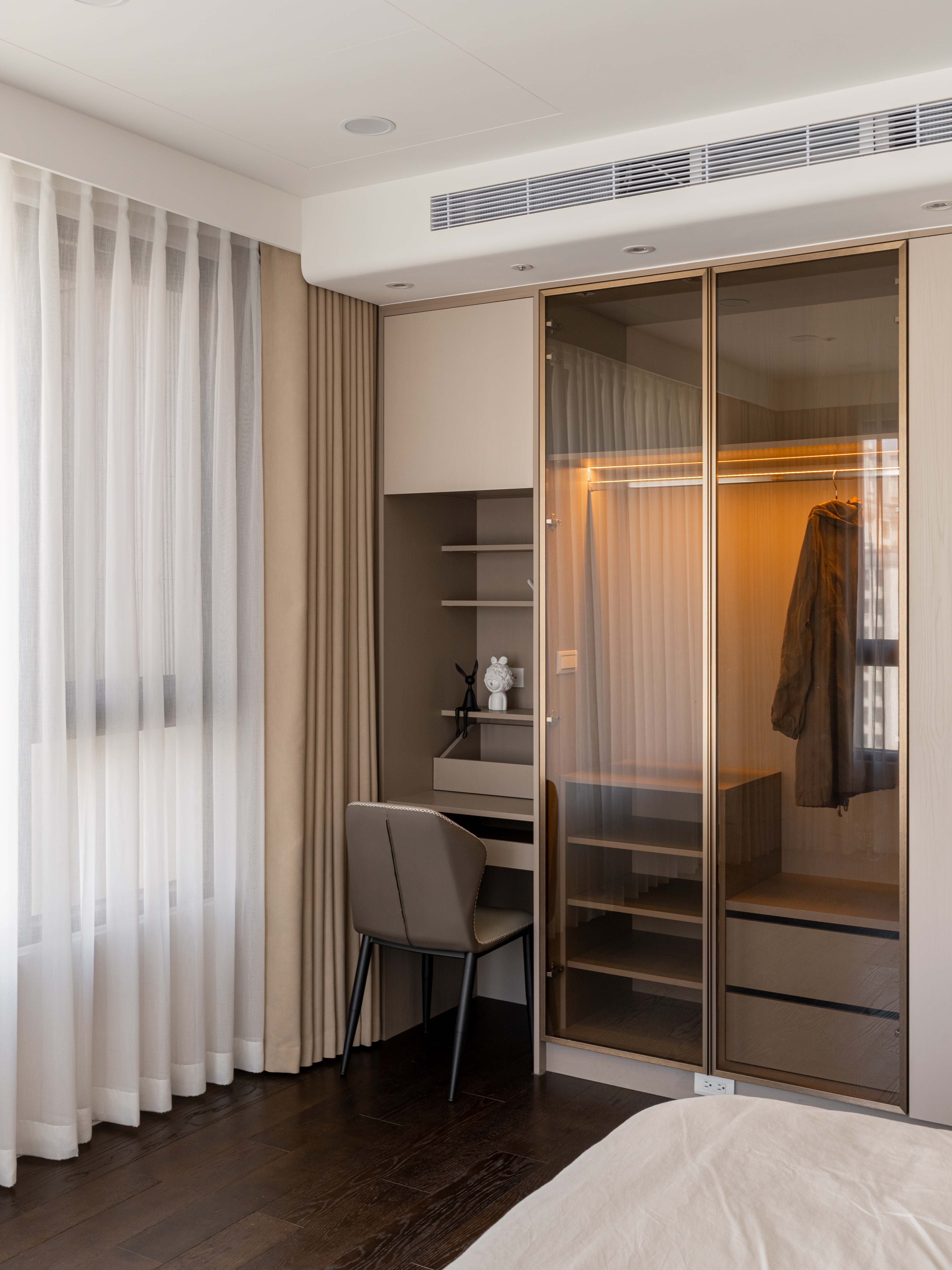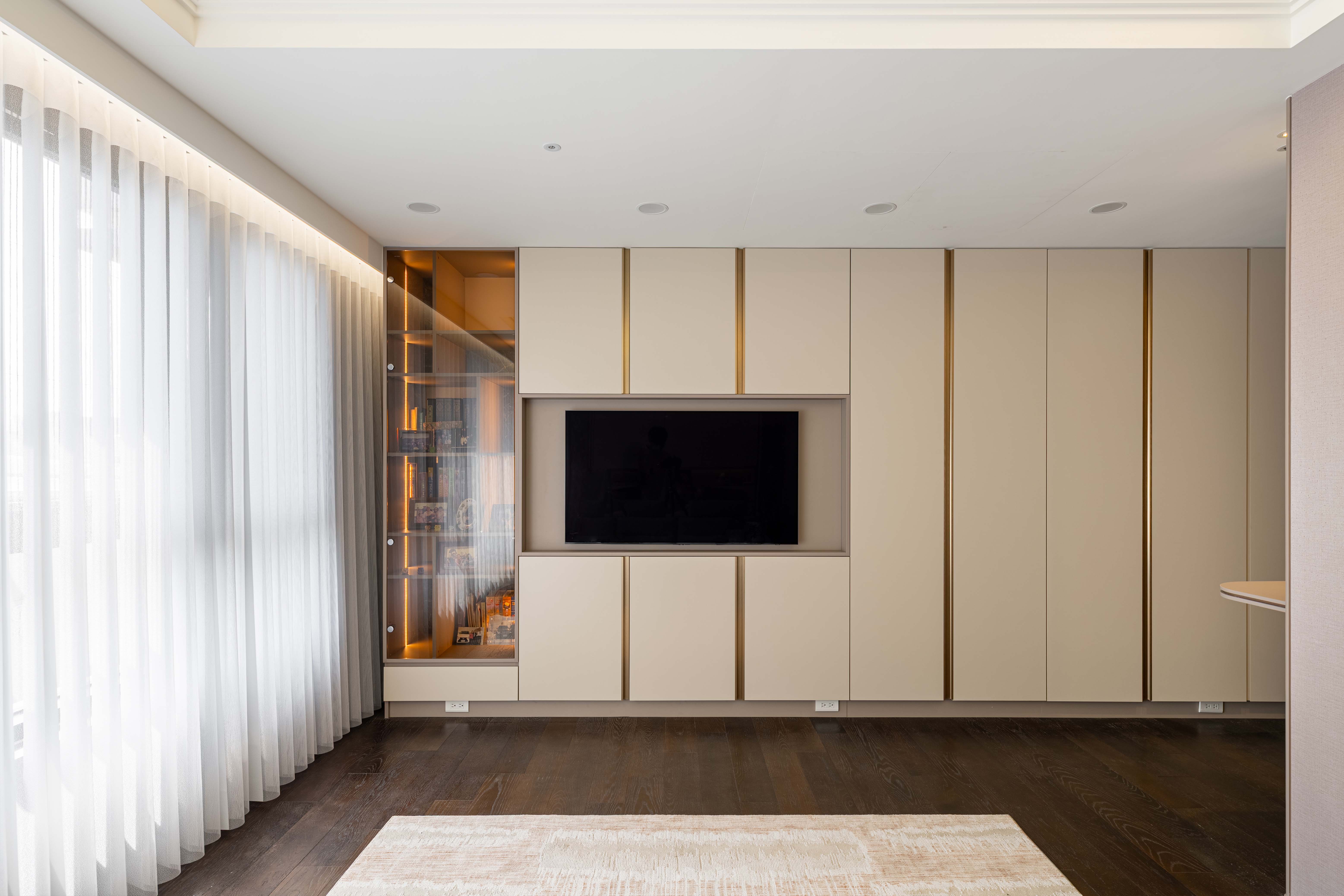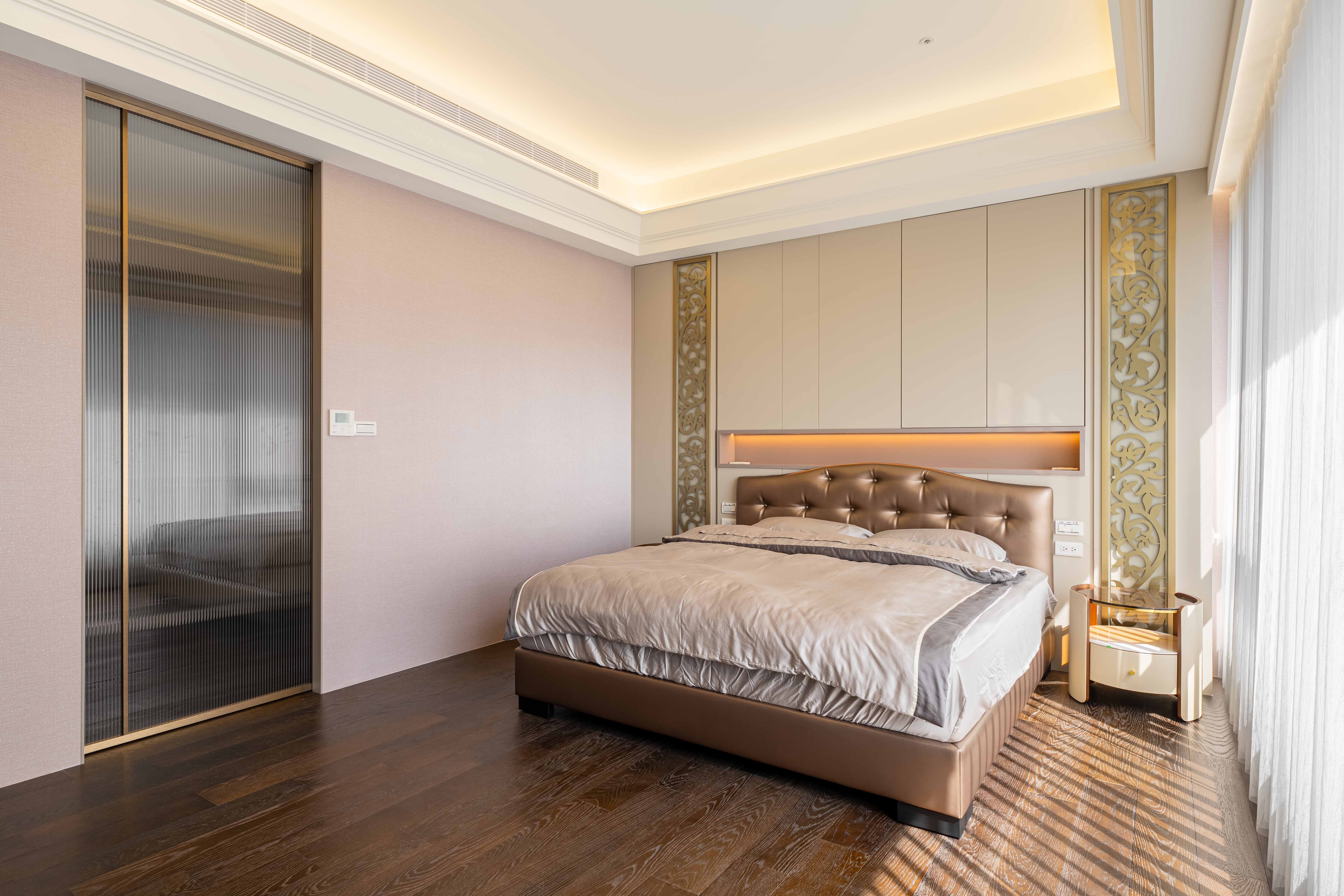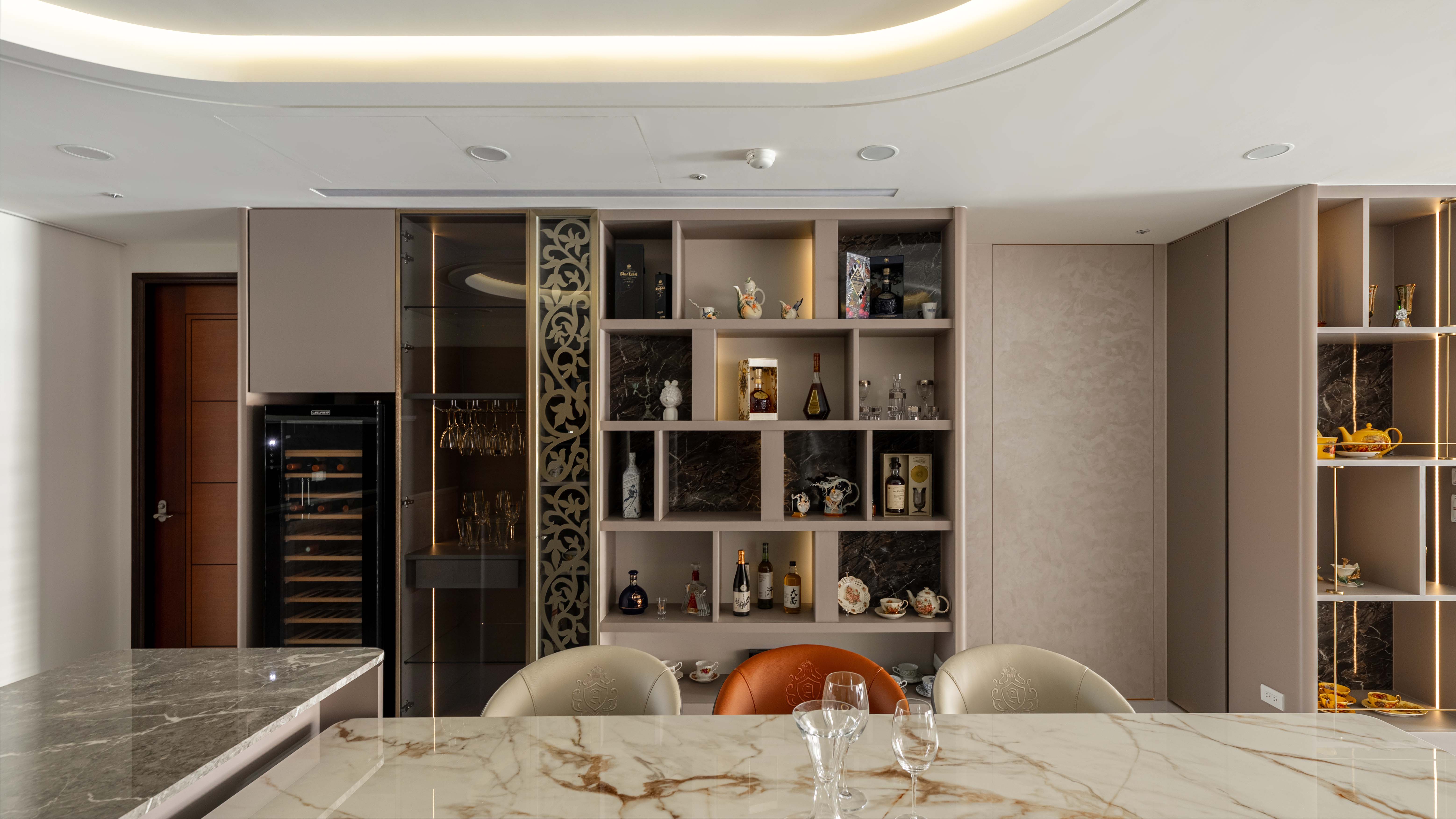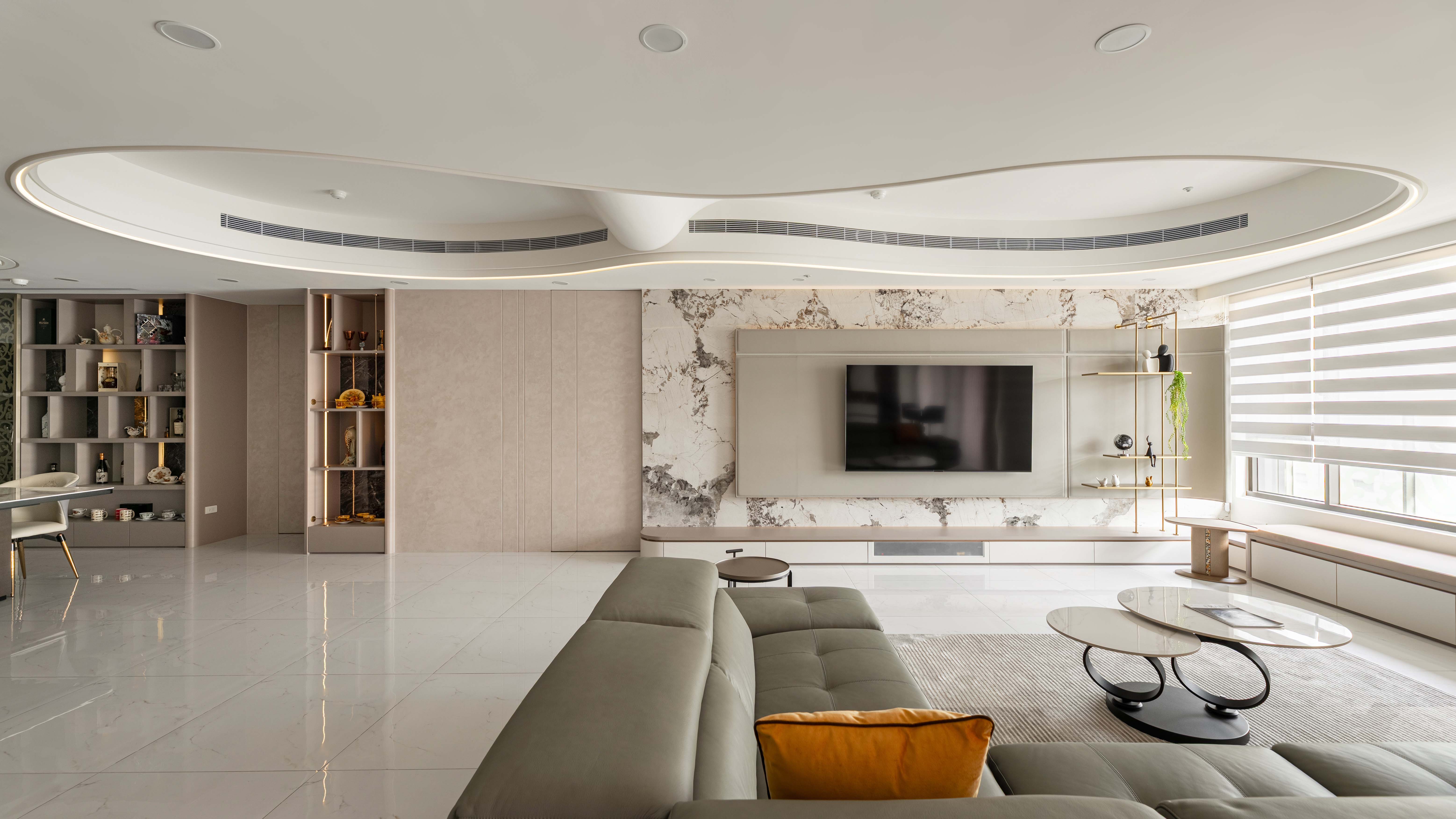 面對室內不可避開的大型橫樑,我們屏棄傳統封板的冷硬,改以「漣漪」為靈感。透過多層次波浪曲線天花導角,優雅地克服壓樑問題,更讓視覺隨燈帶律動,將原本生硬的結構「化剛為柔」,轉化為空間中最大器的藝術亮點